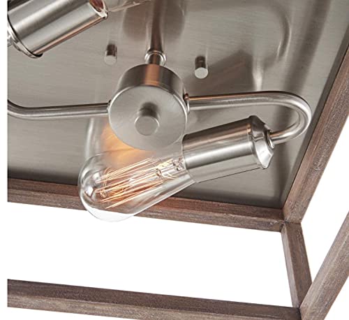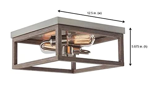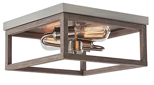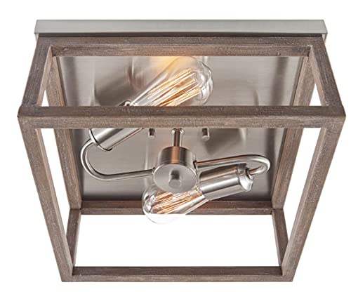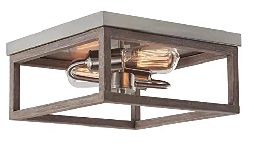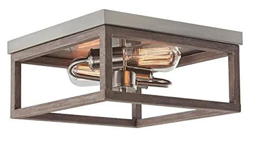 Manifest a lighting experience designed for a life well-lived and meant to be shared with those you love with the Boswell Quarter collection's airy, open-caged flush mount. Inspired at its roots by clean lines and a simple sensibility, brushed nickel finish create an open rectangle around the light source as the entire fixture is topped by a rectangular plate. This uncomplicated design is ideal for illuminating coastal, farmhouse, traditional, and bohemian interiors. - Brushed nickel finish weathered wood accents - No shade - open cage design - 12-1/2 in. W x 5-7/8 in. H - Uses two 100-Watt medium base bulbs (not included) - Dry location listed - Includes all mounting hardware for quick and easy installation - Coordinating products also available