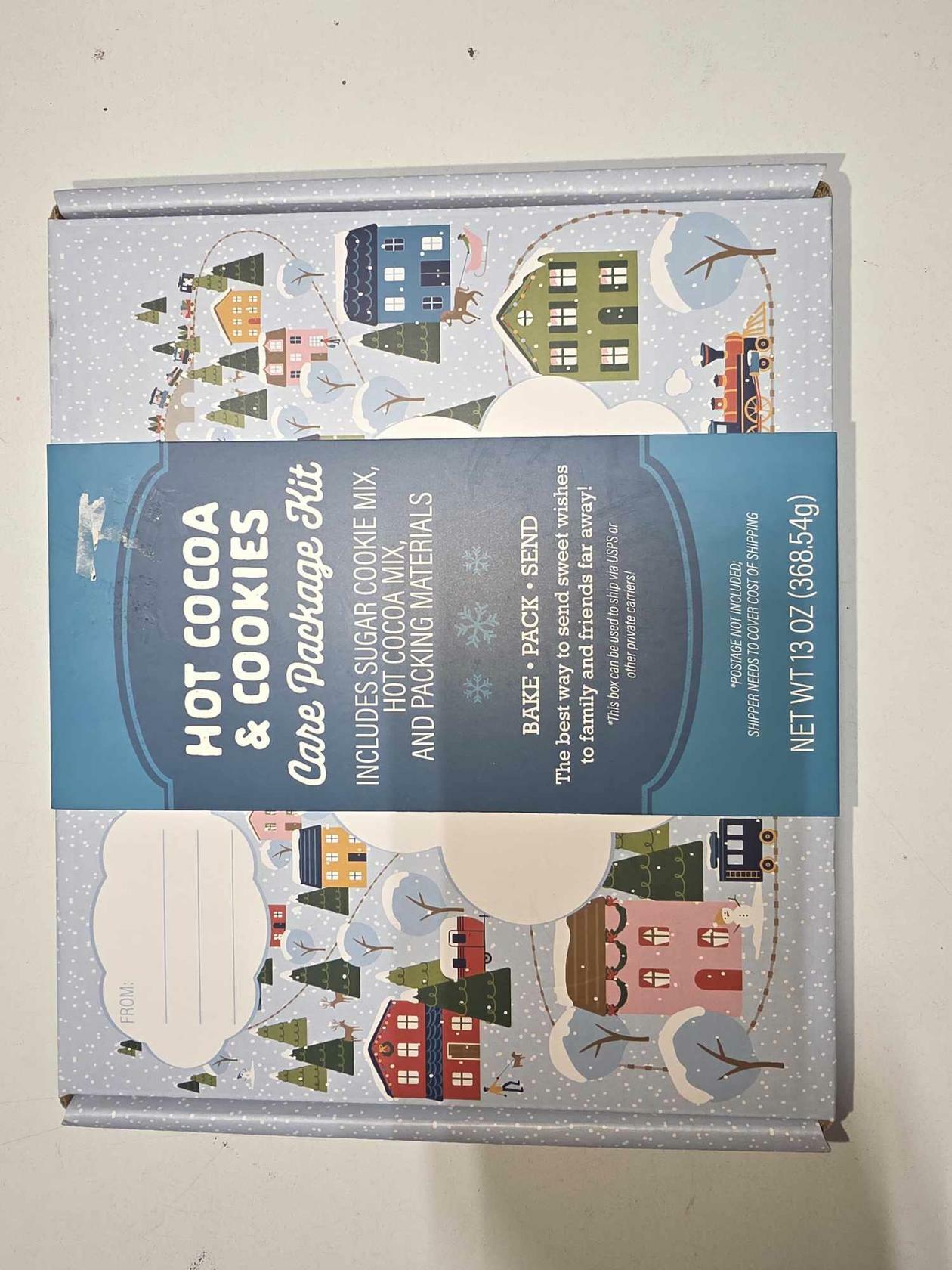 The "Hot Cocoa & Cookies Care Package Kit," which includes sugar cookie mix, hot cocoa mix, and packing materials.