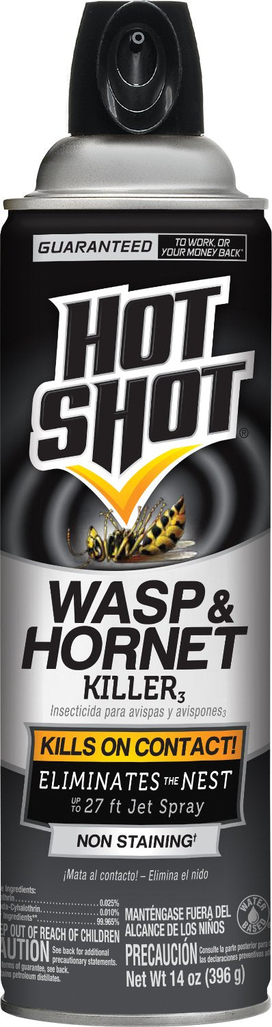 Between the carpool and the couch cushions, youre the CEO of the home front. Take care of your family and take care of business, no matter where household pests rear their ugly heads. Show bugs whos boss with Hot Shot insecticides. Theyre your weapon of choice, giving you the clear advantage within your walls and at the bank. Save the day.Hot Shot Wasp & Hornet Killer3 aerosol kills on contact and eliminates the nest. With a jet spray of up to 27 feet, this product also kills yellow jackets, tent caterpillars and scorpions for outdoor use only. Hot Shot Wasp & Hornet Killer is non-staining to most home siding depending on age and cleanliness (before using in areas where the spray may contact home siding, test in an inconspicuous area and recheck in a few hours). For wasps, hornets and yellow jackets, apply at sunset when insects are least active. Stand a safe distance from the nest dont stand directly underneath. Spray the nest until soaked this products powerful spray will also kill insects that return to the nest over the next few days. Read label for complete instructions before use.When creepy bugs attempt to pass, save the day with Hot Shot insecticides.