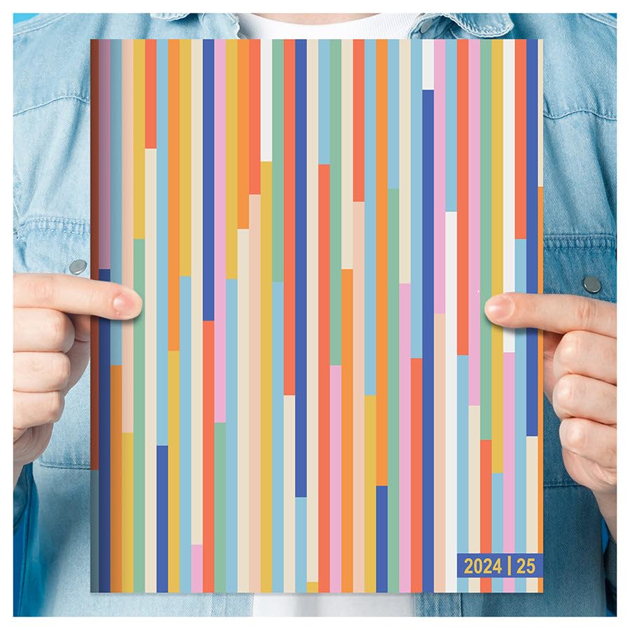Planning is fun with our 9" (w) x 11" (h) academic year monthly planner featuring a brightly colored stripe cover design! This planner has 12 monthly views, July 2024 - June 2025, each spanning two pages. The extra-large grids provide ample room for all of your important information and additional monthly pages for events, appointments, and notes. Bonus pages include yearly views of 2024 and 2025 and lined notes. The premium cover is pliable, yet durable and lays flat. This planner is plastic-free and fully recyclable!