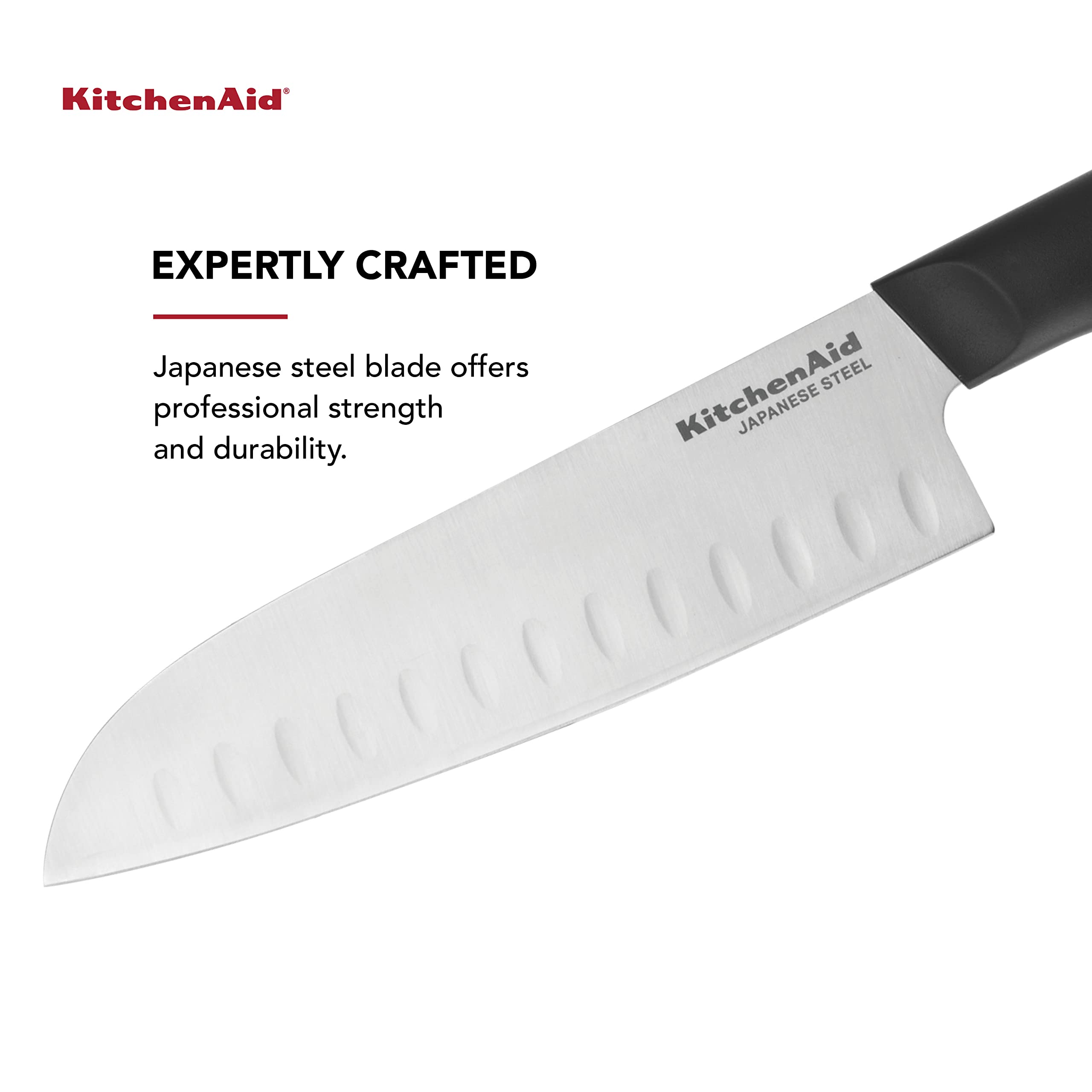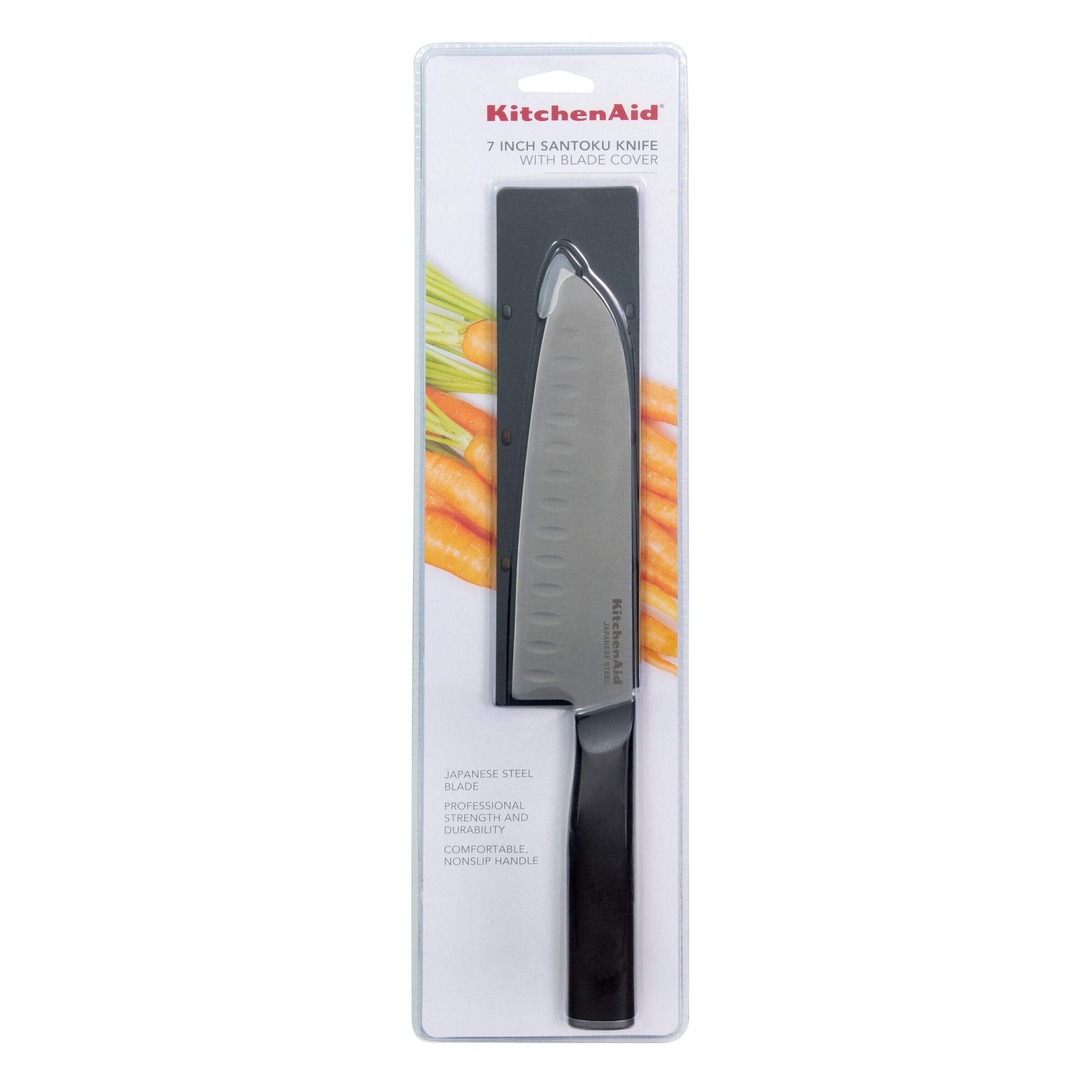 The KitchenAid® santoku knife is a must have for everyday meal prep. The ridges on the blade are specially designed to prevent foods from sticking while you slice, making it perfect for chopping and dicing vegetables. Blades are expertly crafted using semi-polished, high-carbon Japanese steel, hardened and tempered to provide a long-lasting edge for a professional, quality cut every time. This KitchenAid® Knife feature eastern-style ergonomic handles that provide optimal control for everyday use. These handles are expertly engineered with a textured finish for a comfortable grip and accented with a chrome endcap. Includes a custom-fit blade cover for secure, safe storage. KitchenAid® knives are top rack dishwasher safe. To extend the life of your cutlery, hand washing is recommended. Dry immediately.