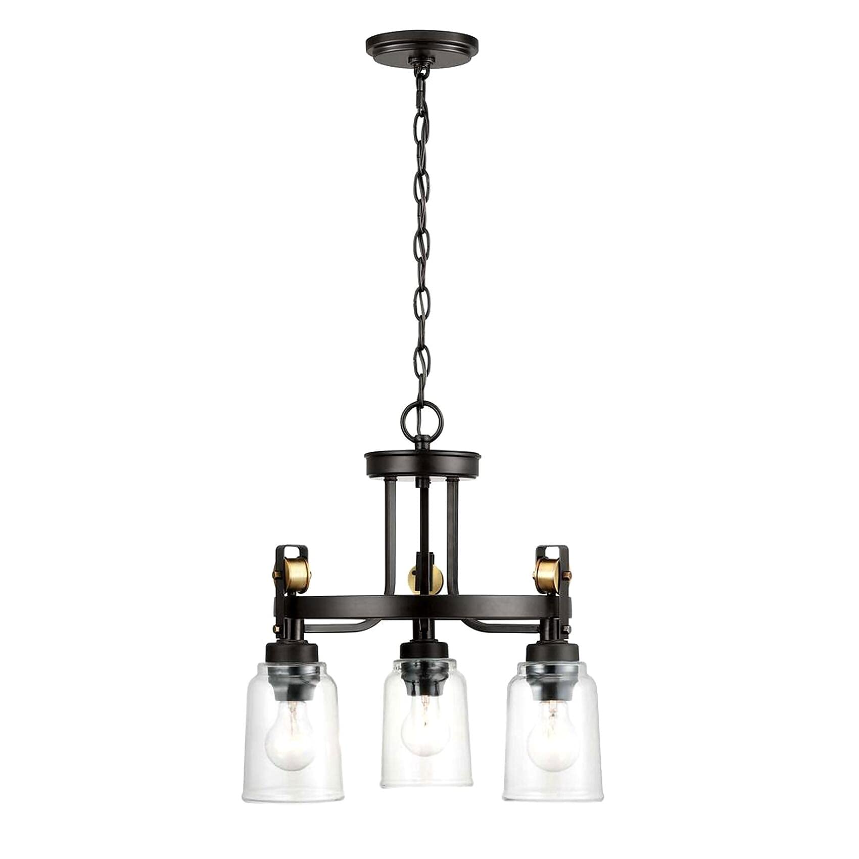 Influenced by a mid-20th century vintage industrial design, the Knollwood lighting collection has clear glass shades that will perfectly highlight the classic Edison bulb. The circular shaped 3-light antique bronze chandelier offers transitional style with timeless appeal. Incandescent medium-base blubs not included. Antique bronze finish Clear glass shades 17-1/2 in. Dia x 17-1/4 in. H Dry location Listed Coordinating fixtures available Includes all mounting hardware for quick and easy installation Includes all mounting hardware for quick and easy installation