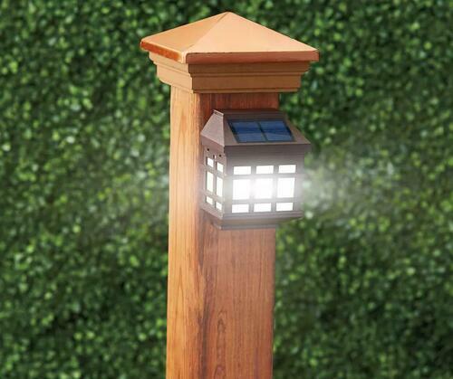 These deck lights look great and expand your outdoor living possibilities when you mount them all around your outdoors for evening illumination. Light your porch, deck or courtyard with these rustic solar deck lights featuring beautiful burnished copper caps crafted in a traditional lantern style. Tough, transparent PVC plastic protects the three LED lights inside while letting out brilliant illumination.