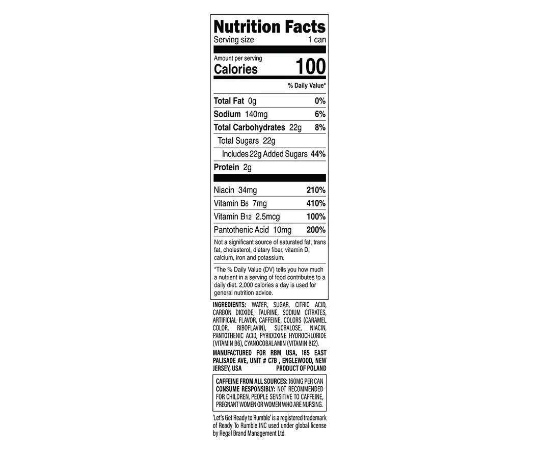 Introducing the Let's Get Ready to Rumble Original Energy Drink - the ultimate fuel for your active lifestyle. Packed with a powerful blend of caffeine, B vitamins, and taurine, our energy drink delivers a punch of energy to help you power through your day. With a knockout flavor that's sure to please, this energy drink is the perfect choice for anyone who needs a quick pick-me-up. Whether you're a busy professional, a student pulling an all-nighter, or an athlete gearing up for a big game, our energy drink is here to help you stay on top of your game. Plus, our energy drink is low in sugar and calories, making it a healthier choice than many other energy drinks on the market. And with a convenient, grab-and-go can, you can take it with you wherever you go - to the gym, to work, or just out and about.