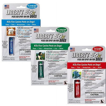 Liberty 50 II Plus IGR Flea and Tick Spot-On Treatment for Dogs 3-Month Supply 3 Month Spot-On Treatment kills FIVE pests on dogs: fleas ticks mosquitoes lice and mites. For use on dogs and puppies 12 weeks of age and older. Includes IGR (Insect Growth Regulator) which inhibits the life cycle of insects. Features: Made in the USA Kills repels and prevents re-infestation of fleas for up to 5 weeks Kills flea eggs and larvae for up to 8 weeks Breaks the flea life cycle Kills repels and prevents re-infestation of ticks for up to 6 weeks Kills and repels mosquitoes lice and mites on dogs for up to 4 weeks Item Specifications: Net Contents: 3 Applicators (each containing 0.18 fl. oz.) Sizes: Small: 11-32lbs Large: 33-66lbs X-Large: Over 66 lbs Active Ingredients: Permethrin (CAS# 52645-53-1) : 50.00% Pyriproxyfen (CAS# 95737-68-1) : 1.20% Other Ingredients: 48.80% Total: 100.00% Warnings: see back panel packaging for full list of precautions. NOT FOR USE ON CATS.