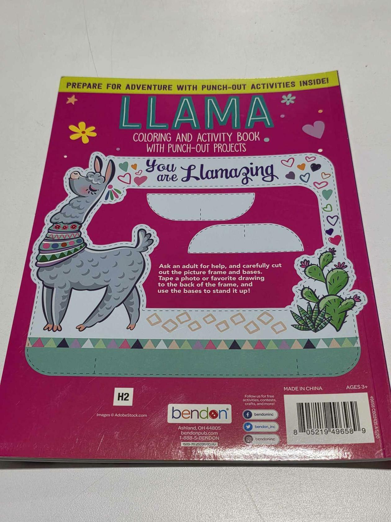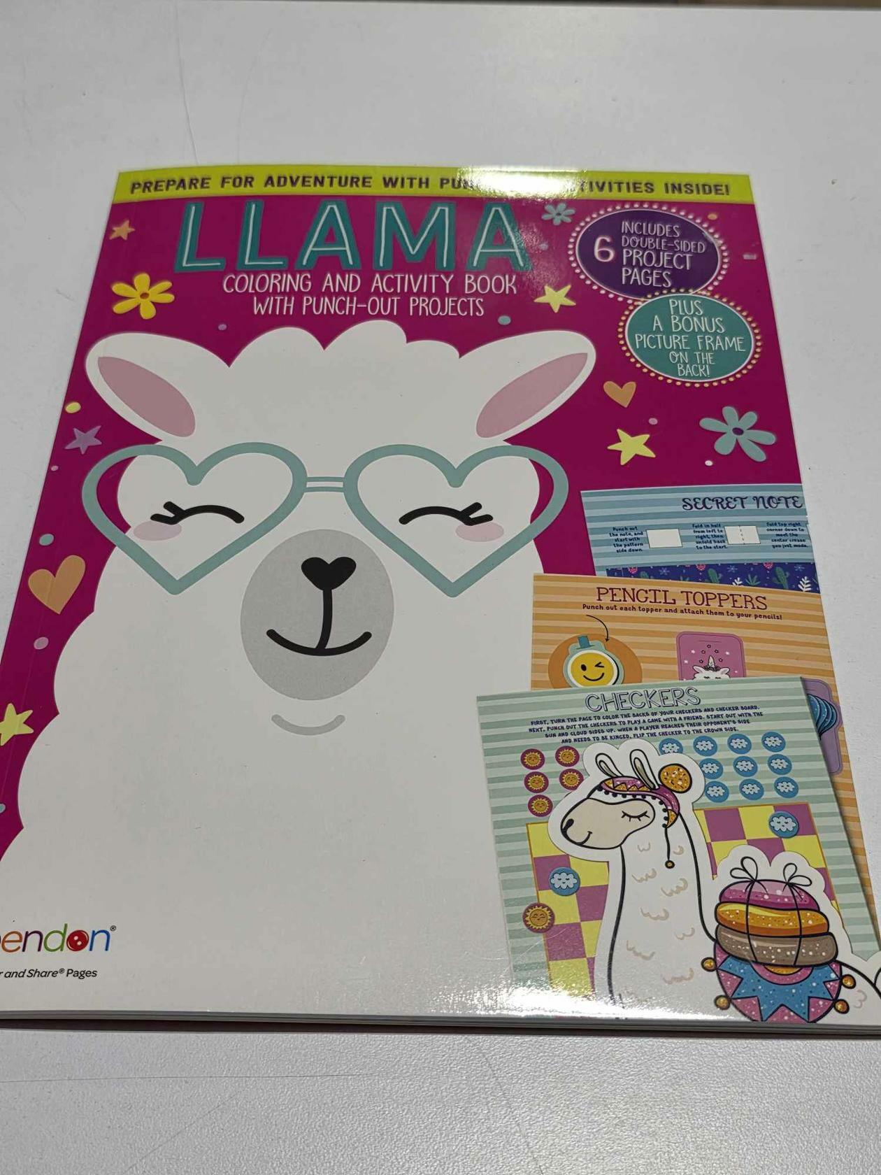 Llama, coloring and activity book with punch out projects. Llama coloring and activity book with 6 punch out projects. This includes six double sided project pages plus a bonus picture frame on the back.