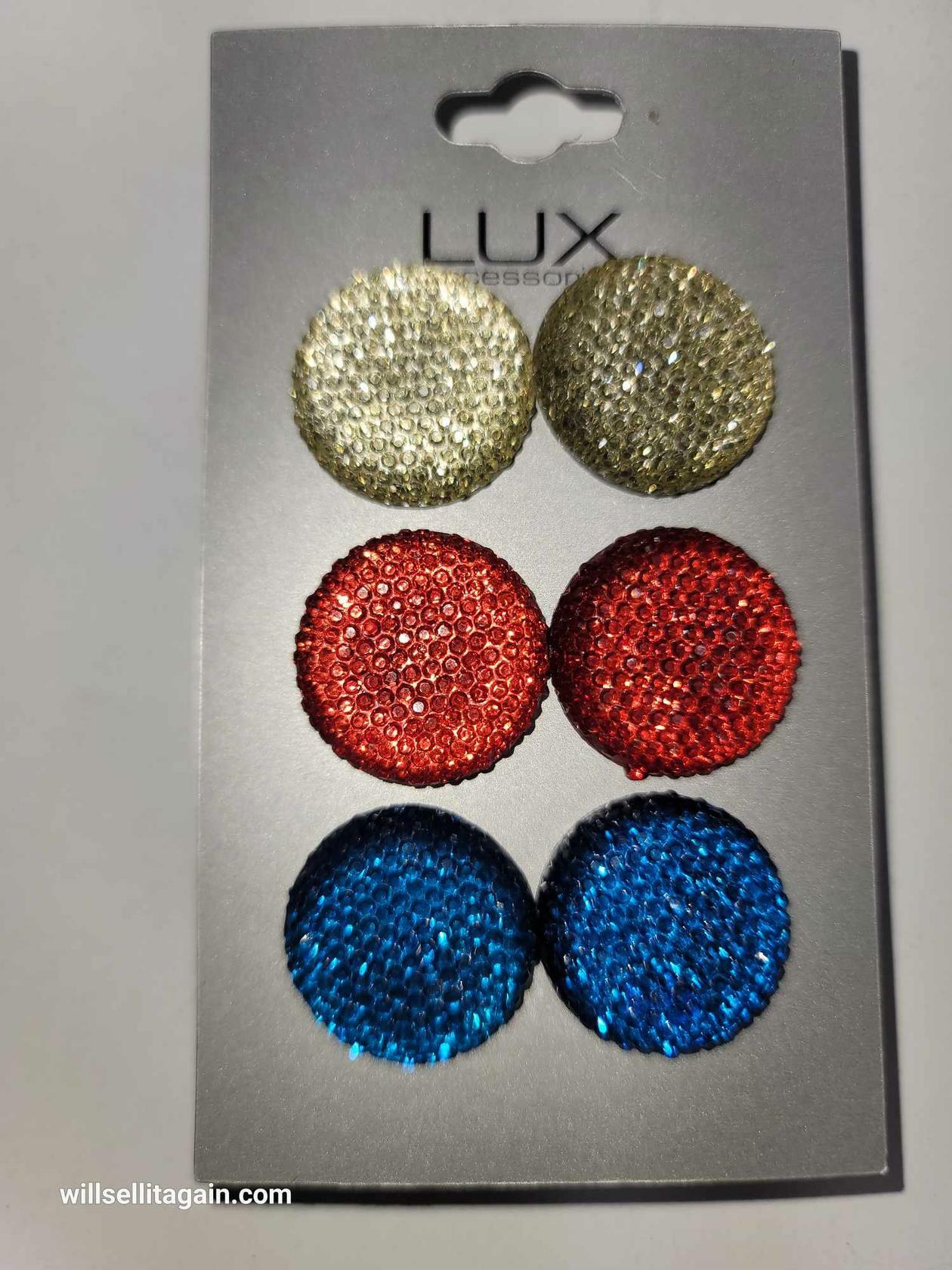 LUX Earrings Crystal Set 3 Gold, Red, Blue 3/4 in diameters FEATURES