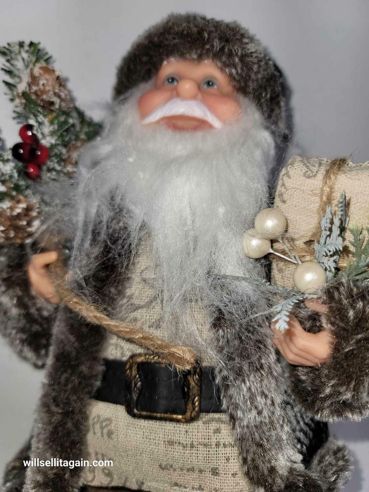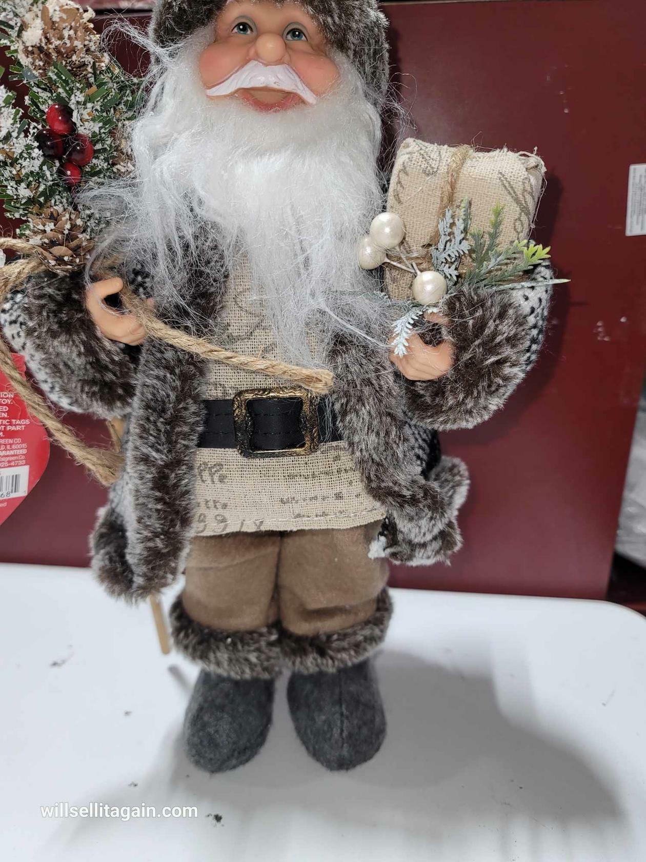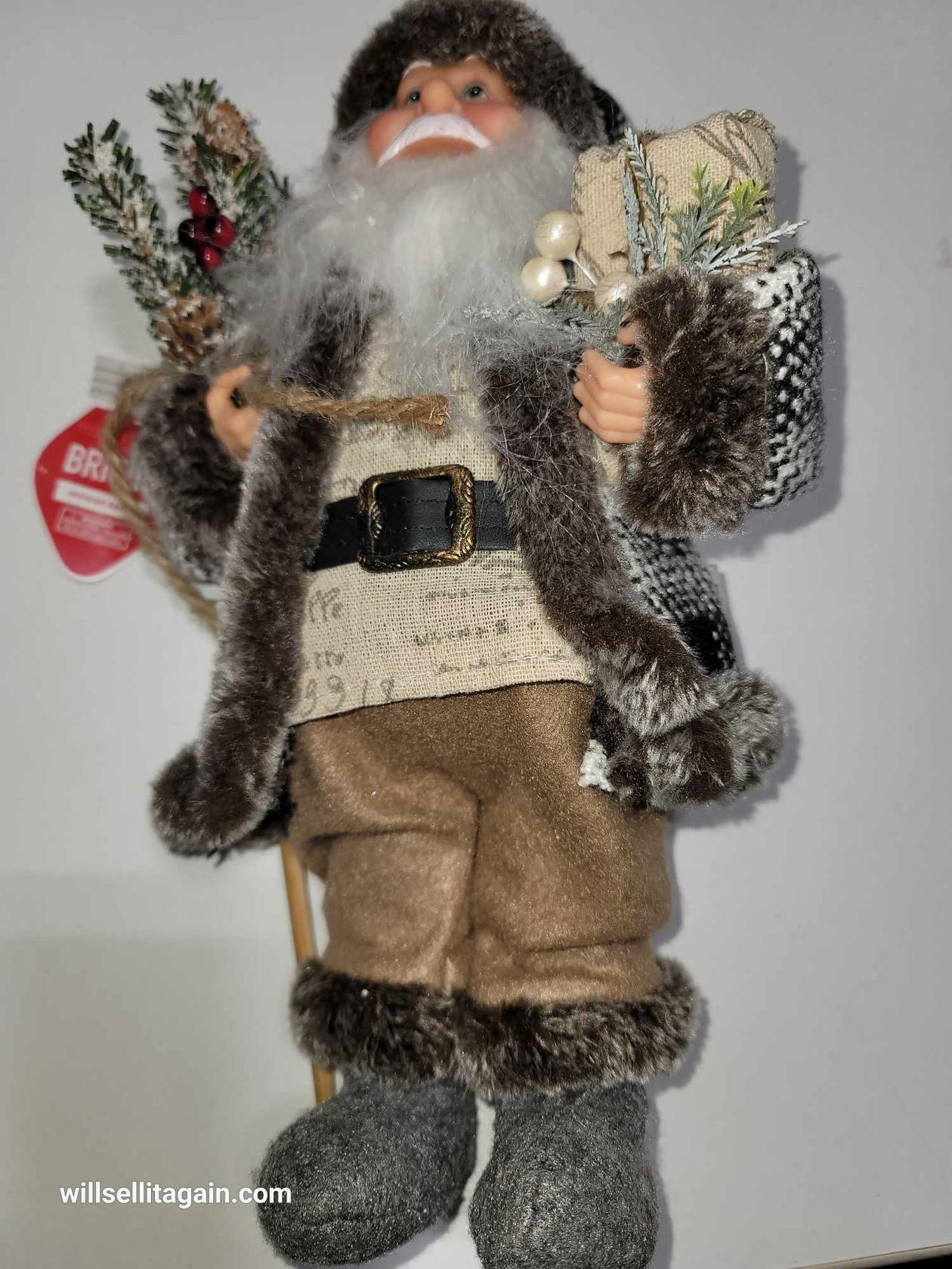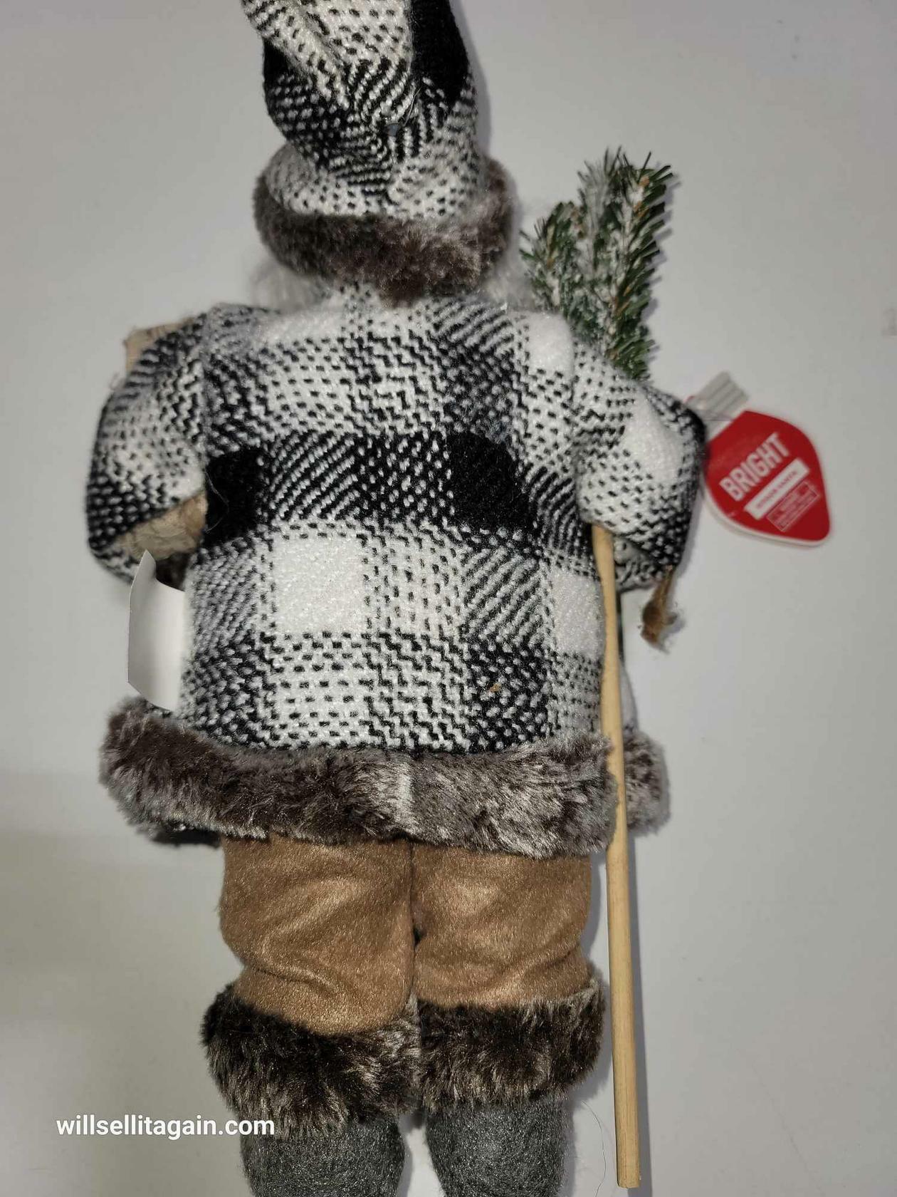 Take a look at this amazing Santa. He is wearing Rustic coat and Hat in a black and white plaid pattern. He is holding a present. He has on Tan pants and Grey boots.