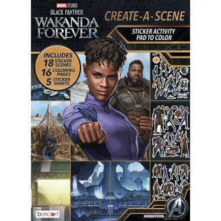 Decorate colorful scenes and tell a story with stickers in Bendon s Black Panther Create-a-Scene 40 Page Sticker Book! This paperback activity book combines our classic coloring and activities with interactive sticker play that will entertain your young artist for hours! Each book contains 18 full color scenes to decorate 5 pages of repositionable stickers sheets full of all your child s favorite characters and 16 coloring and activity pages. That s a total of 32 pages of coloring and activity fun! Unleash your child s creativity and tell a story through stickers. This is an official Disney Marvel Studios licensed product and is ideal for children 3 years and older for beginner level coloring.