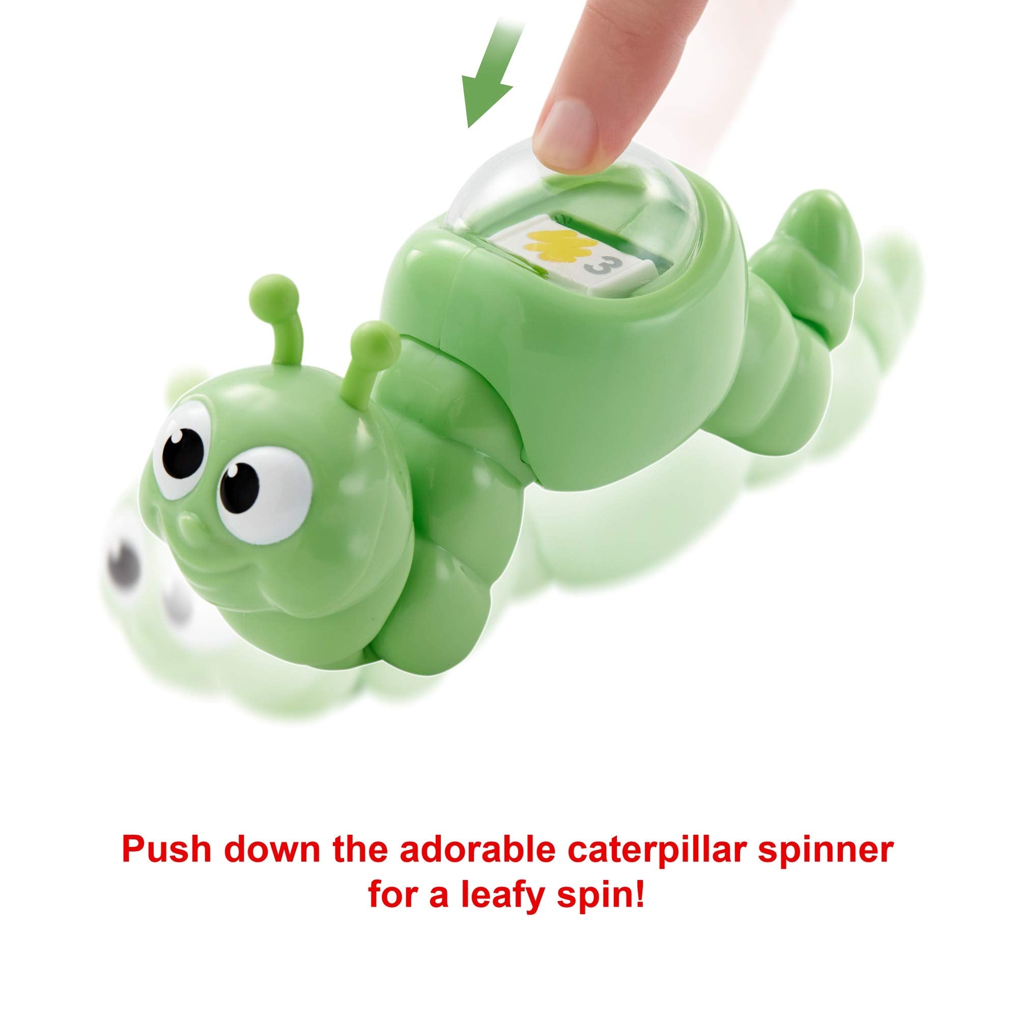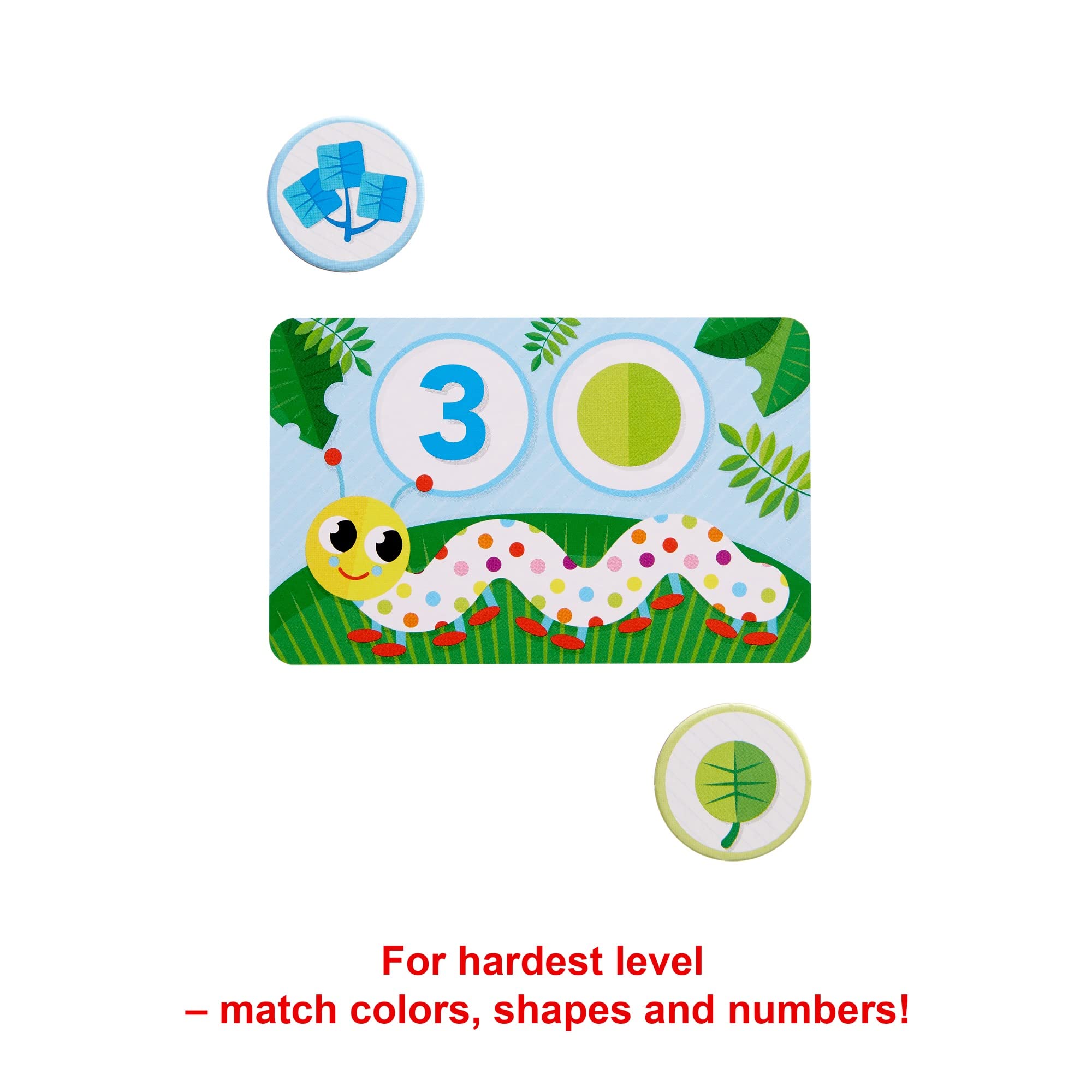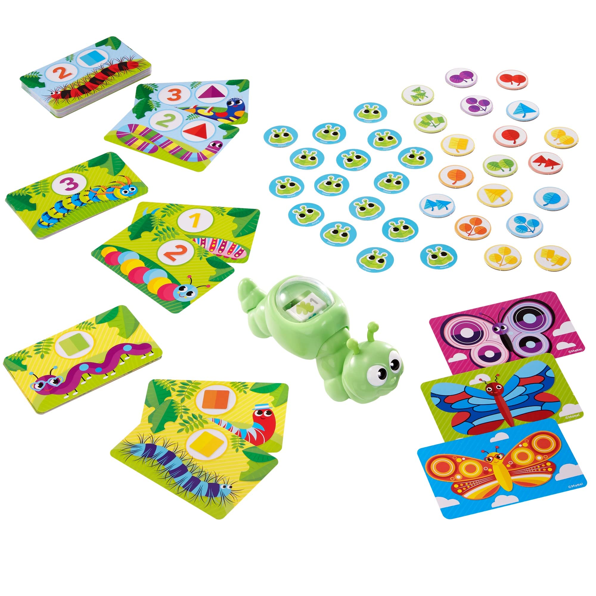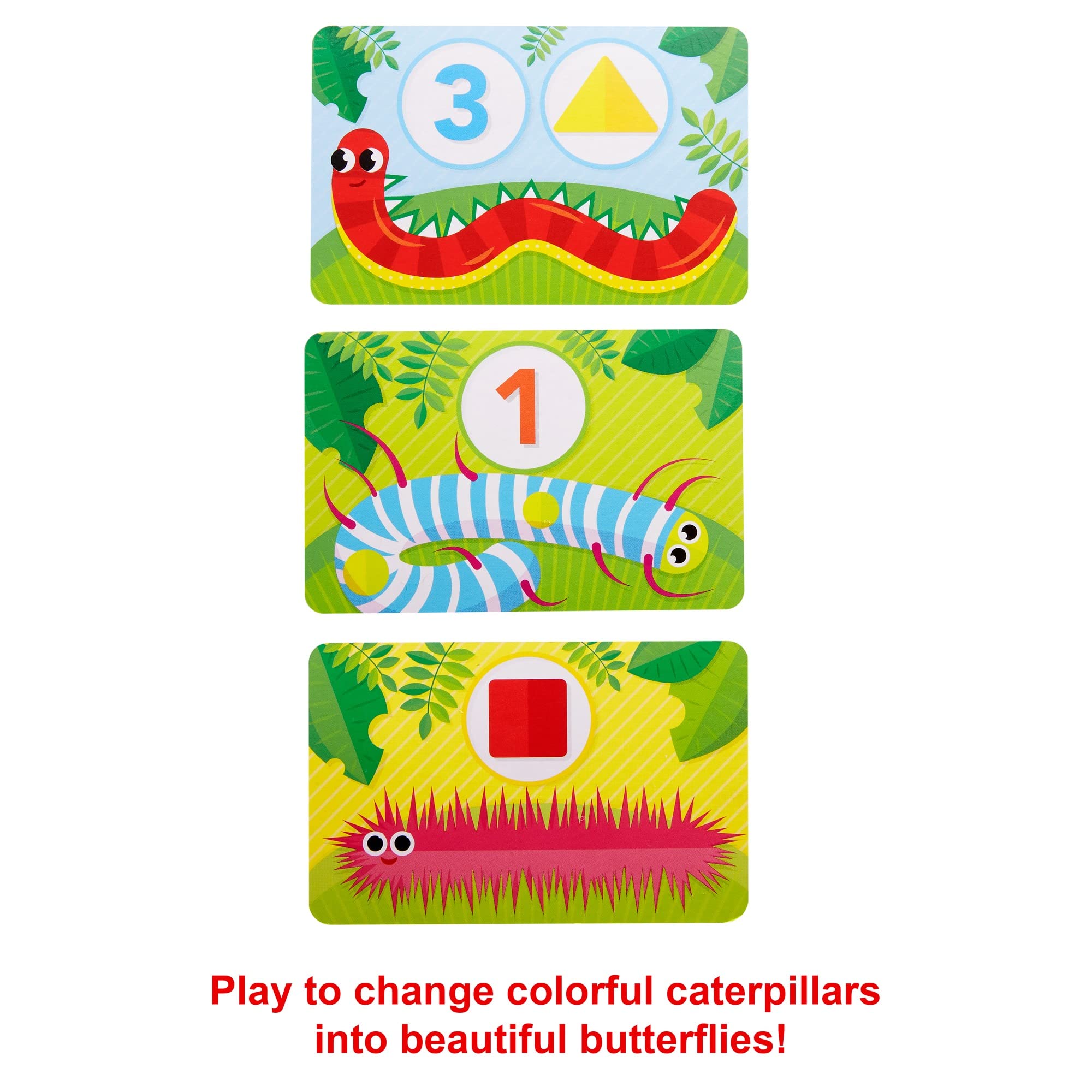 Education and wonder meet with the Patty Pillar pre-school game, which features a friendly, bouncy inchworm that has a spinner in his back! Push down on the Patty Pillar spinner, then let goit pops back up with a leafy spin! Kids help find leaves for Patty Pillar's worm friends so they can all transform into butterflies! Just use the spinner, then match the leaf tokens to cards. Up to 6 kids ages 3 years and up can learn taking turns and matching colors. Three levels of play include (1) matching colors and shapes, (2) colors and numbers and (3) matching colors, shapes AND numbers! Kids can learn color, shapes and numbers and critical thinking. Colors and decorations may vary.