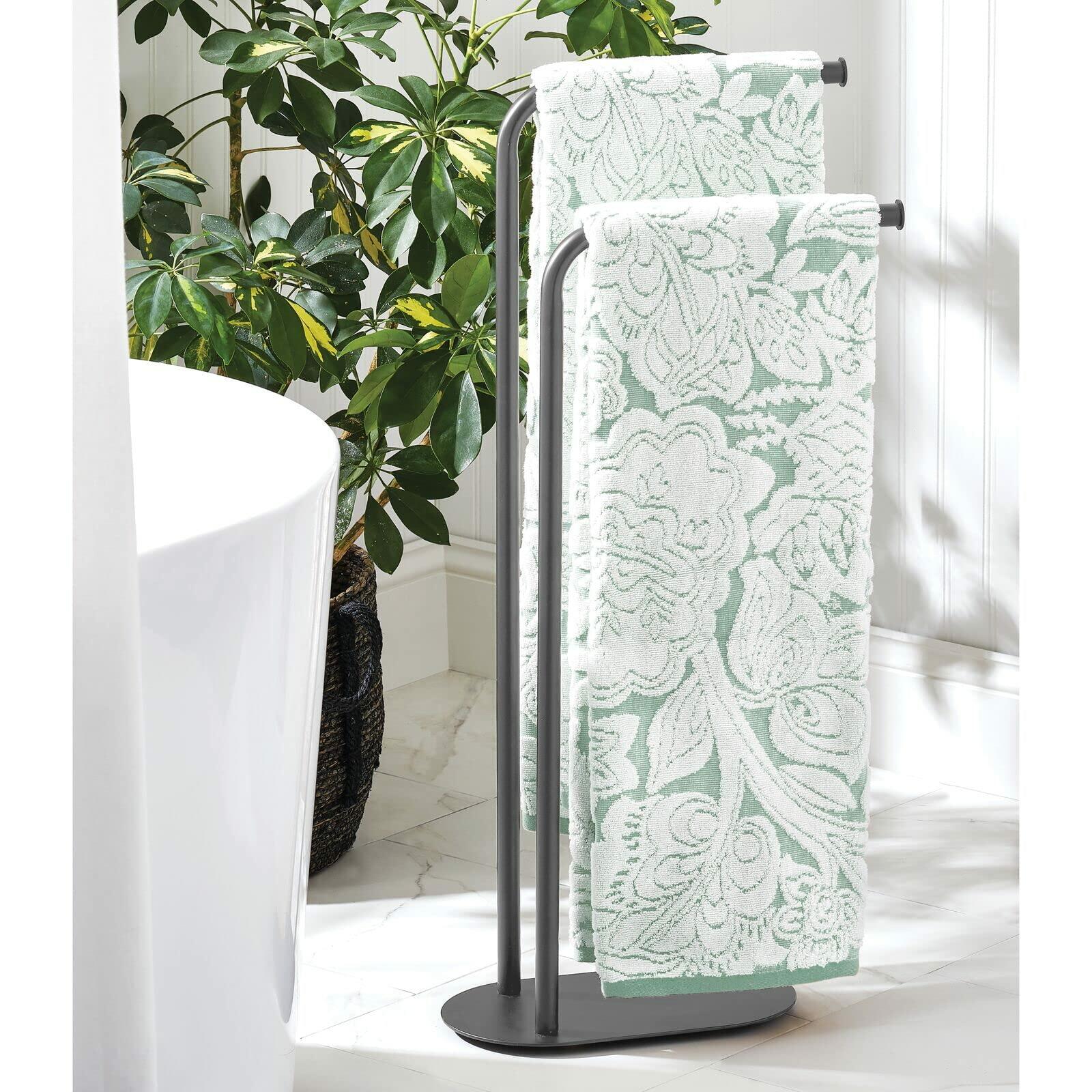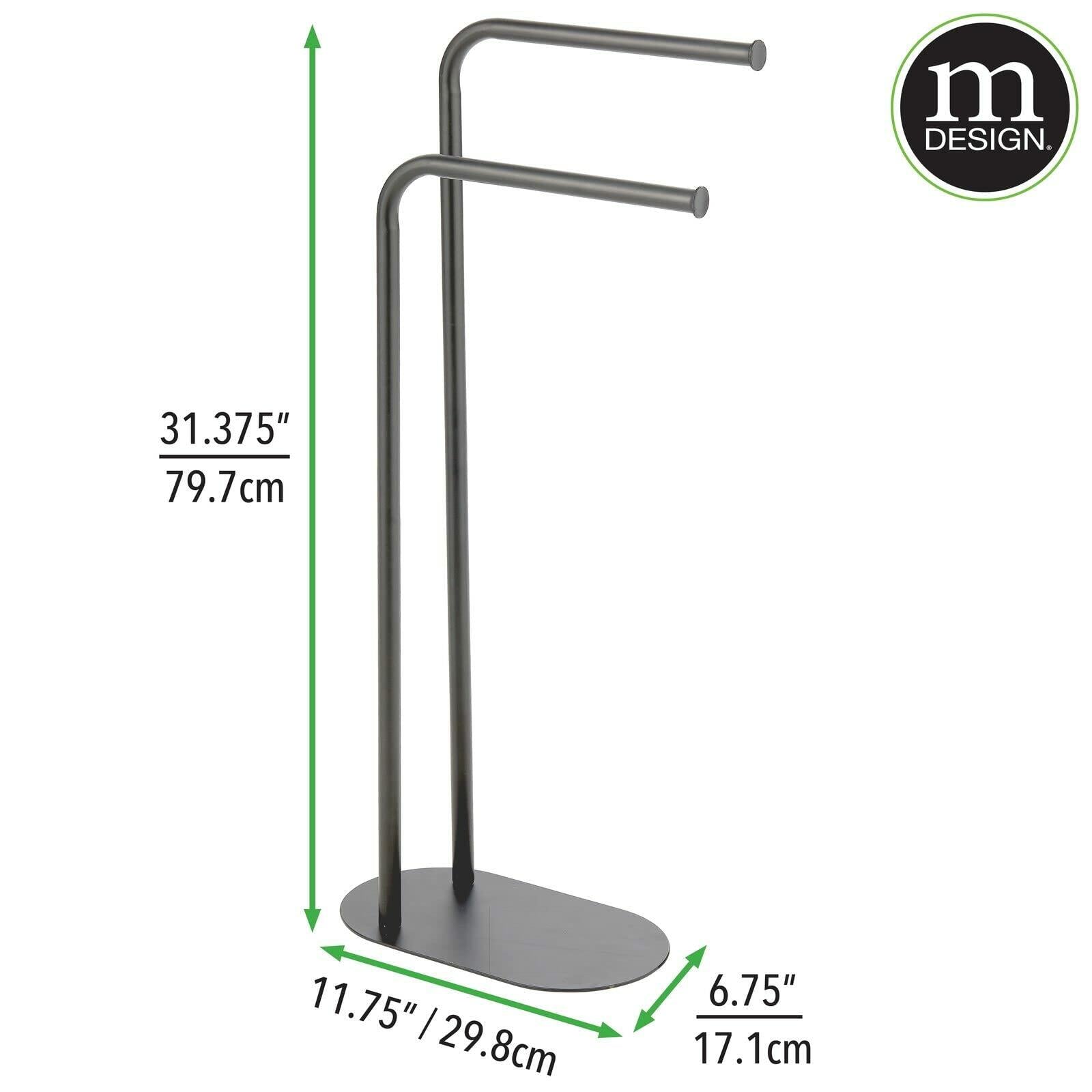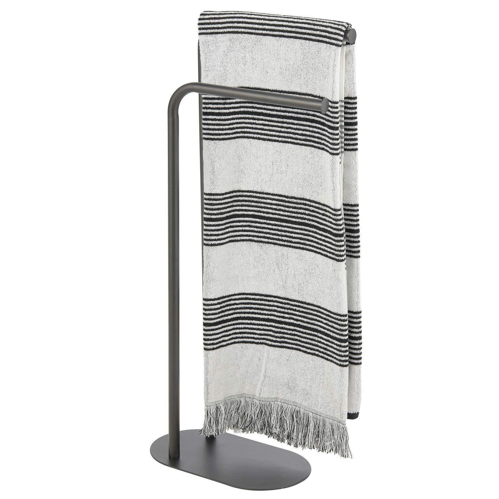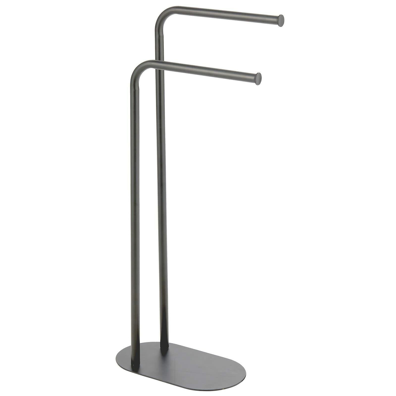 Features two bars for hanging bath, face and hand towels of all sizes. Sturdy base keeps the stand upright and helps prevent tipping. Wipe clean with damp cloth. Made of strong steel with a durable rust-resistant finish.