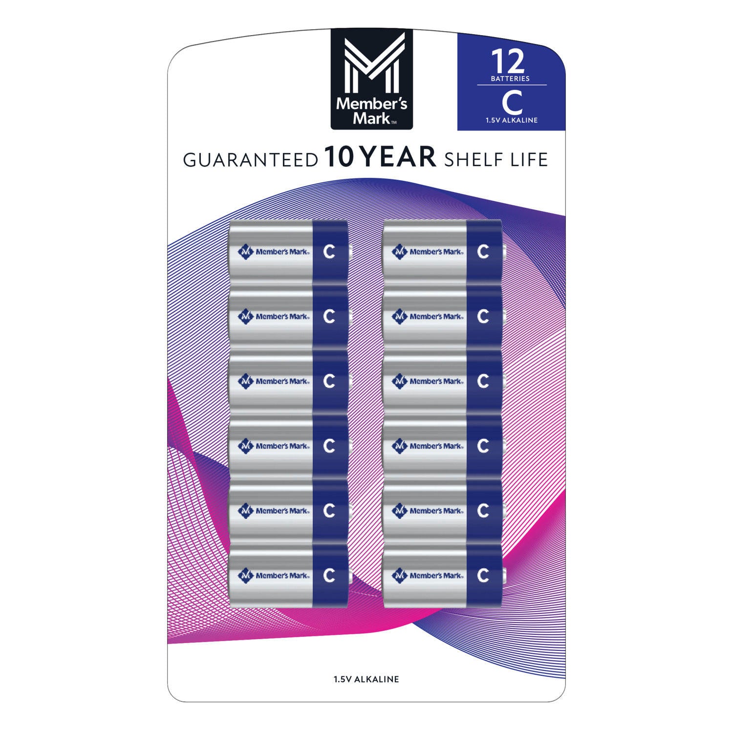 Member's Mark Alkaline C Batteries (12 Pack). Member's Mark Alkaline C Batteries provide the power you need to keep your C battery devices going. These batteries have a guaranteed 10-year shelf life, so you can trust they’ll be ready when you need them. This bulk pack of 12 batteries is an outstanding value – making it the perfect choice for homes, schools, companies, and more. Because this 12 pack of C cell batteries is backed by the Member's Mark brand, you can trust each battery has undergone rigorous testing and meets the highest standards of quality and performance.