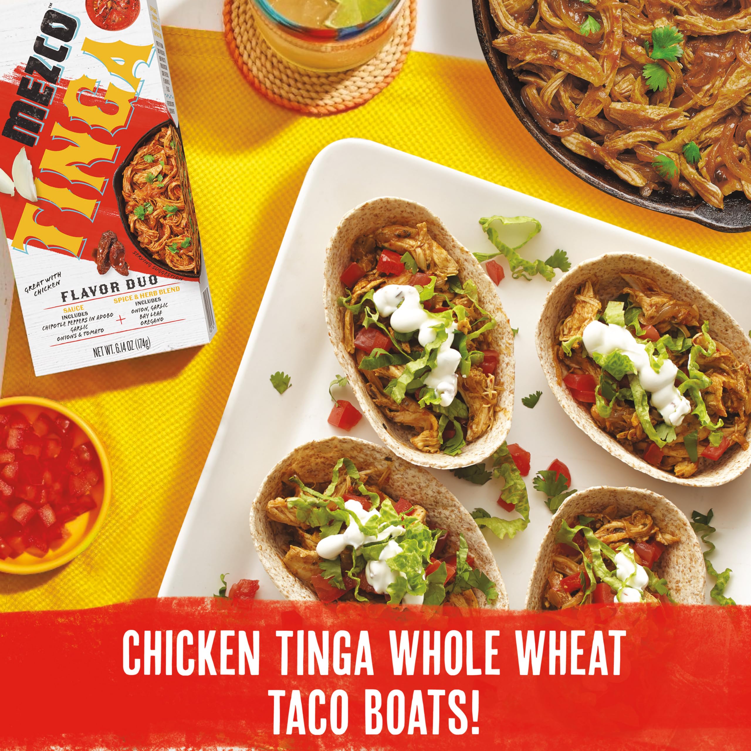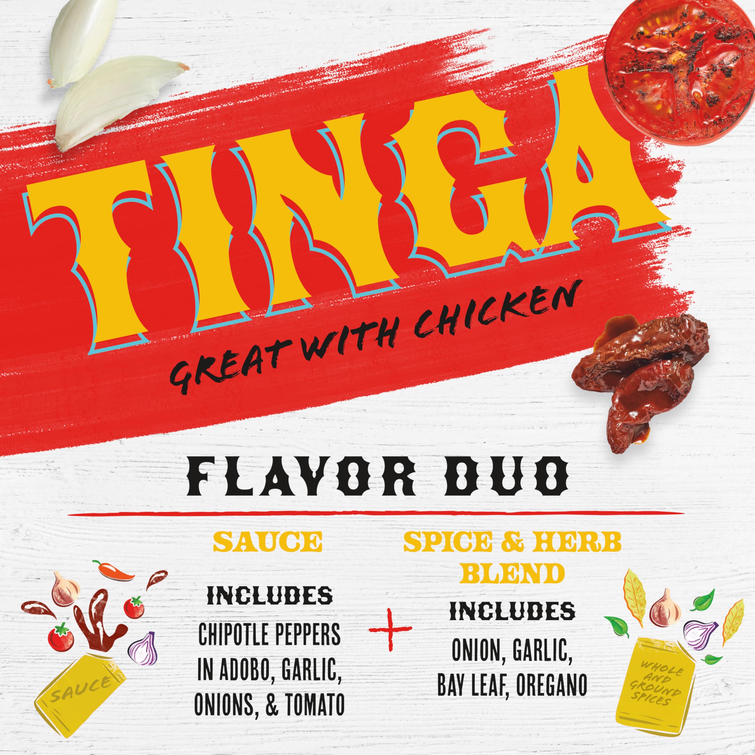 Transform any dinner into a flavor adventure with the addition of Mezco Tinga Flavor Duo. This kit of sauce and our special spice and herb blend is the start of a Mexican style meal that you can make on your own. Just add chicken and follow the simple steps on the package to enjoy a taste of Mexico at home! The sauce includes chipotle peppers in adobo, garlic, onions and tomato. The spice and herb blend includes onion, garlic, bay leaf, and oregano. Together, you get a mildly spicy balance of rich and smoky flavor that excites the taste buds. Ideal for busy families, our meal shortcuts are designed to give you all the deliciousness, none of the frills. To complete your meal, try pairing the completed Chicken Tinga with rice and beans. Or, use tostada shells or tortillas as your base, then add Chicken Tinga, top with sour cream, and sprinkle with crumbled queso fresco and shredded lettuce. Whether you crave exploring enticing dishes for family dinners, expressing yourself through flavorful creations, or love adding your own unique spin to foods, creativity in the kitchen begins with Mezco Flavor Duo kits.
