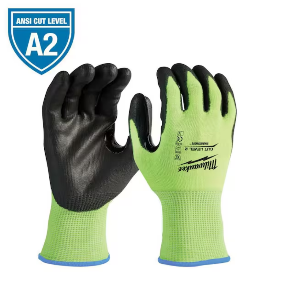 The MILWAUKEE Medium High-Visibility Cut Level 2 Polyurethane Dipped Gloves are designed to provide a Better Fit and Better Protection. These hi-vis cut resistant gloves have a reinforced nitrile coating between the thumb and index finger for enhanced durability in high wear points. The cut resistant gloves feature SMARTSWIPE touchscreen compatible fingertips. The cut level 2 gloves are knit with 15-Gauge for better dexterity when handling small objects. These breathable gloves are lightweight for comfortable all day wear. Milwaukee offers hi-vis medium glove sizes so users can find their perfect fit. Milwaukee High Visibility Gloves feature color ID bands for easy identification of cut levels.