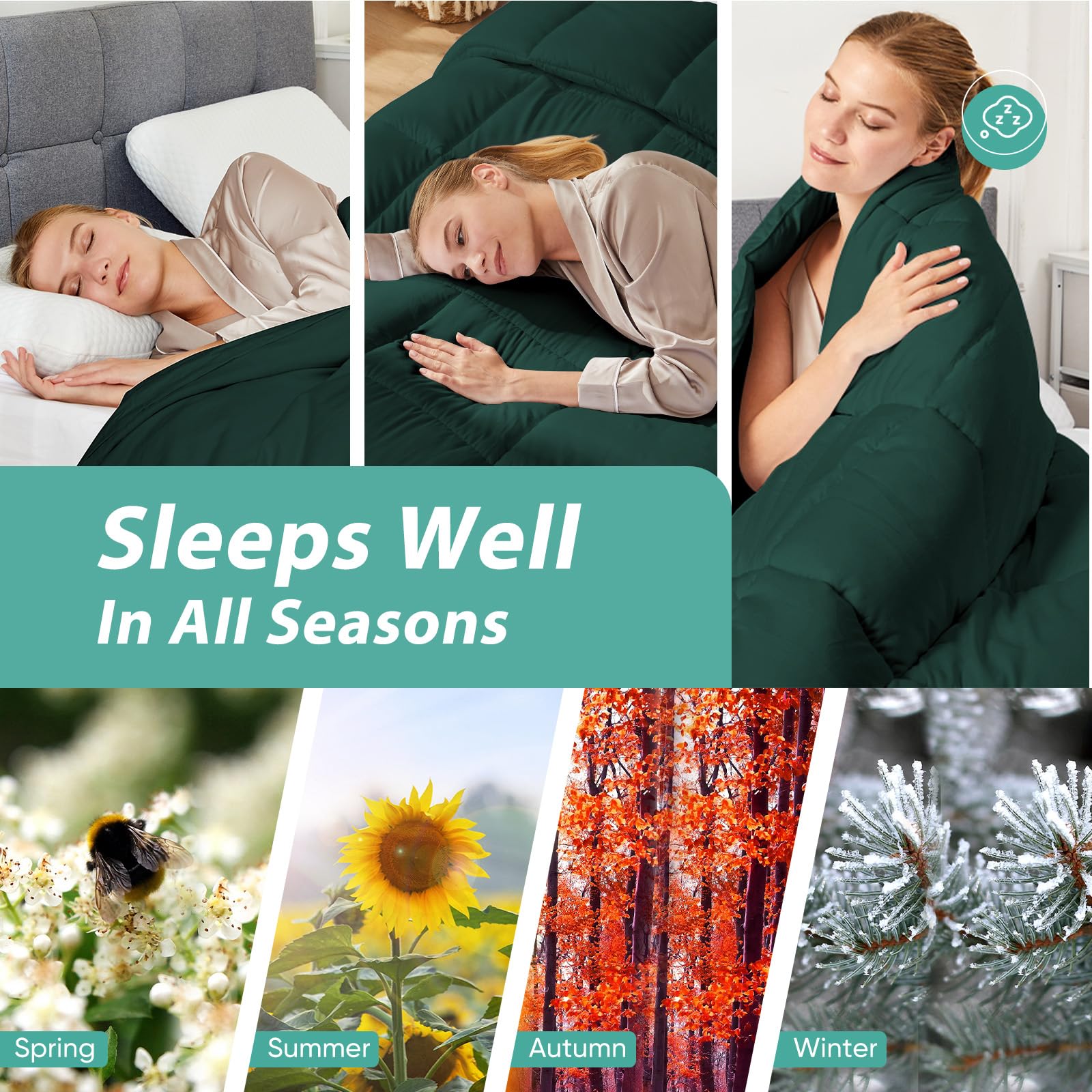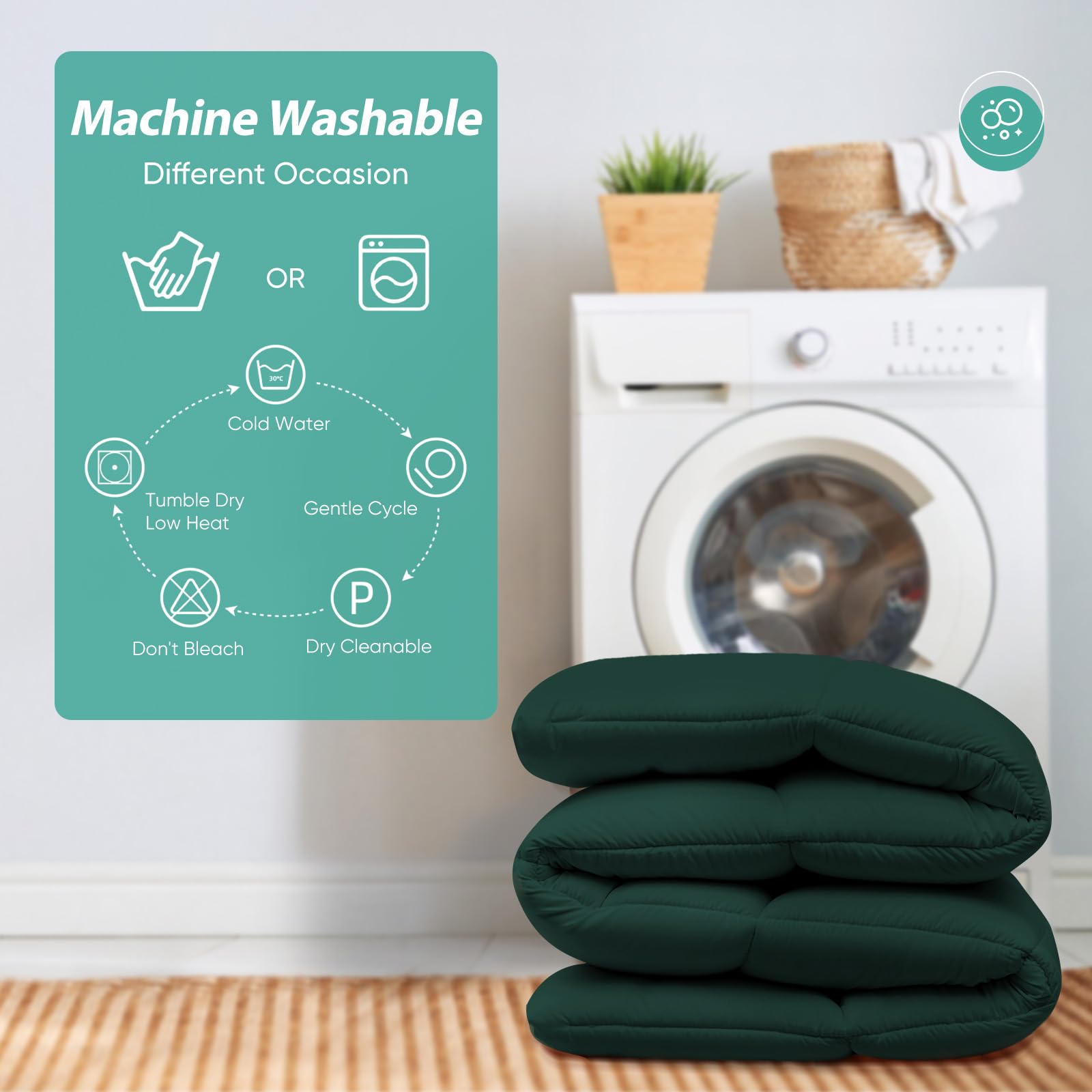 The brushed fiber surface made by unique microvilli processing technology, makes the comforter softer and skin-friendly. 3D & 7D cooling goose down alternative fiber whole-piece filling, makes the comforter soft and fluffy, warm and comfortable, suitable for those who cannot use goose down and feather bedding