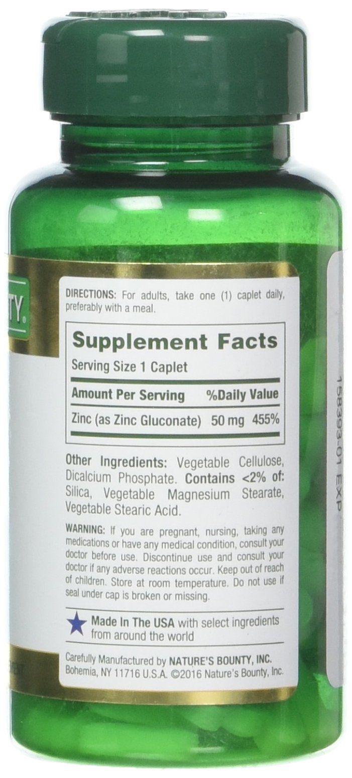 Description: Support your immune system and overall health with Nature’s Bounty Zinc.* As the #1 brand for Zinc supplements** we understand that Zinc is a trace element that plays a vital role in immune support.* One Nature’s Bounty 50 mg Zinc caplet per day provides more than your daily requirement of this essential mineral to help you feel your best.* Research shows that taking a Zinc supplement year-round has many wellness benefits. In addition to playing a vital role in immune support Zinc can also function as an antioxidant in the body contribute to bone and skin health and assist in the formation of DNA.* As a component of the enzyme collagenase Zinc has been clinically studied for its contribution to skin health.* To help meet lifestyle needs Nature’s Bounty Zinc caplets are non-GMO and free of gluten and sugar. With over 50 years of expertise and as the #1 Brand for Zinc supplements** Nature’s Bounty is your trusted source for Zinc.