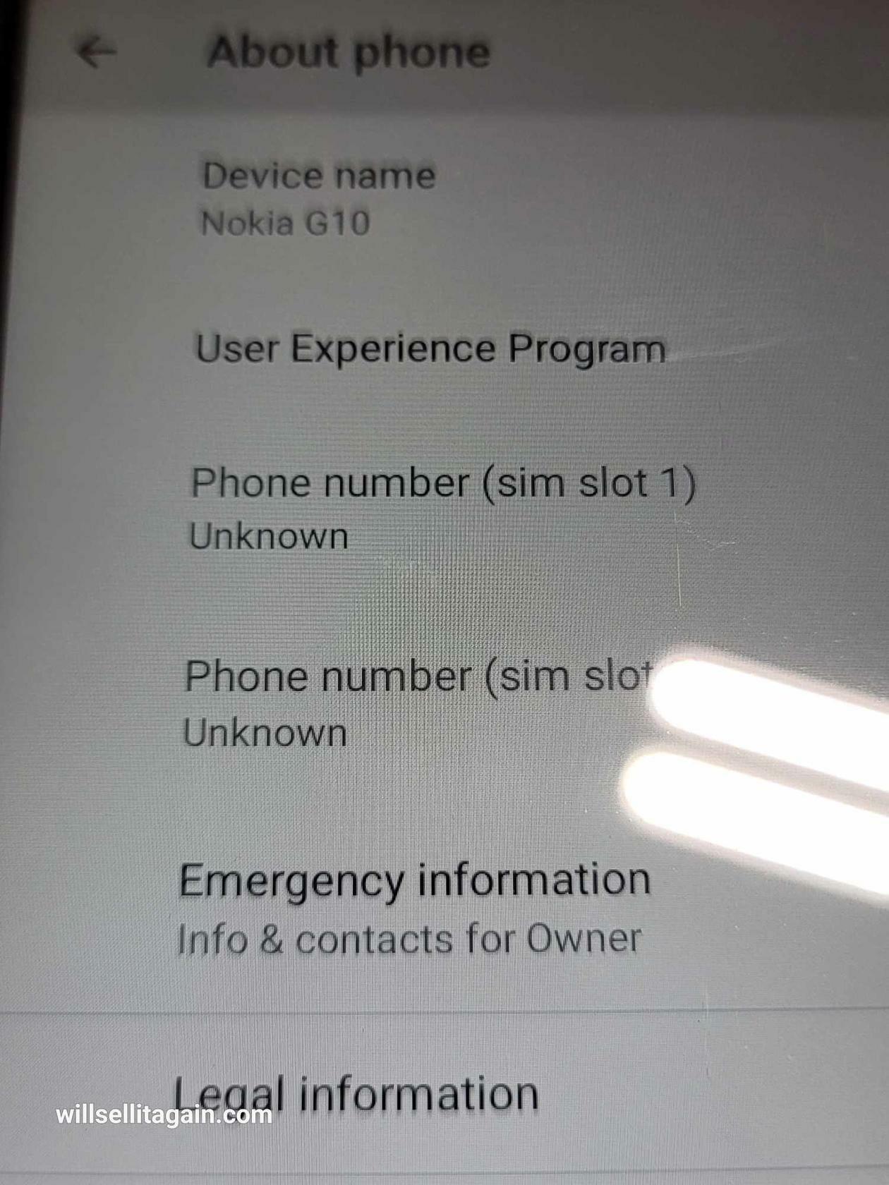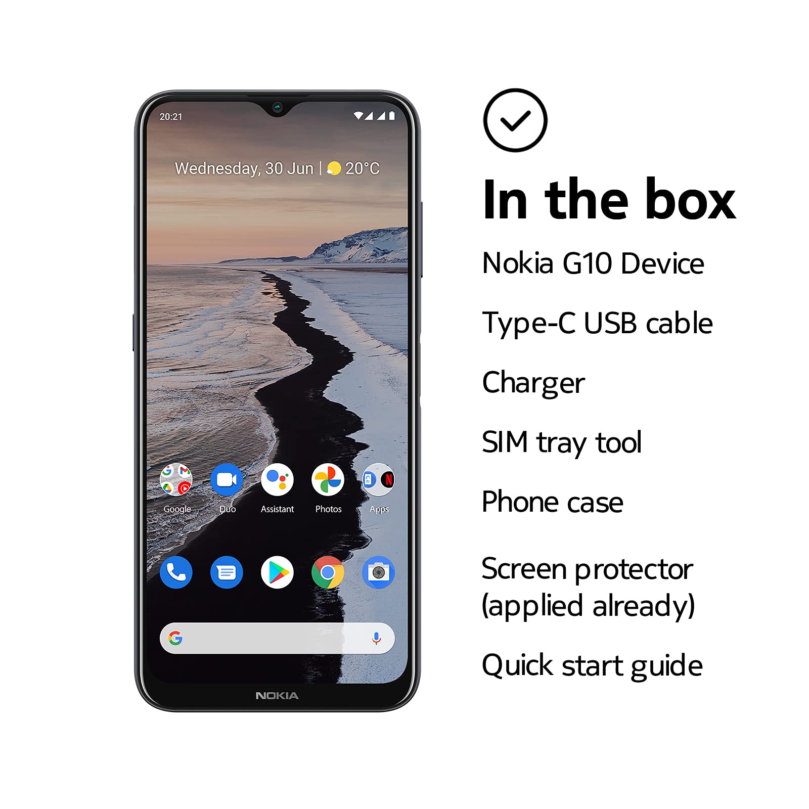 To make the most of family life, you need plenty of energy. Luckily for you, Nokia G10 has a battery that goes days between charges – for more time to captivate your kids on the bigger screen. And with a triple rear camera, complete with enhanced imagery, you’re always ready to catch those special moments. Plus, when you reach the end of the day, there’s still plenty of power for you to unwind – why not call a friend, or catch up on your favorite show? Compatibility: This device is designed to work with GSM carriers. This product will not support Verizon or Verizon subsidiaries. Please confirm compatibility with your chosen carrier before purchasing. For support with SIM card or network related issues, please contact your carrier for assistance in connecting your device to the chosen compatible network. Supported Network bands: 2G: 850 / 900 / 1800 / 1900 3G: 850 / 900 / 1700(AWS) / 1900 / 2100 4G/LTE: 1, 2, 3, 4, 5, 7, 8, 12, 13, 17, 28, 66 Charging: This product is designed to be charged using the charging adapter and charging cable that are provided in the product box. Charging this device with any other charging adapter or cable may cause device malfunction. Please observe basic safety steps when charging this device and do not charge this product with malfunctioning or damaged equipment. Current Software Version: Android 10 Bluetooth Version/Range: 4.2 – 30’ Range FAQ How can I install available updates? In many cases updating your product to the latest software version will alleviate any issues experienced. To update your device please navigate to Settings > System > System update > Check for update to check if updates are available. Follow the on screen prompts to install the latest software version if available.= How can I close an app that has stopped working? Open Settings on your phone and select Apps. Then find the app you're having issues with and select Force Stop. I want to conserve battery life. How can I activate the Power Saver mode? On your phone, open Settings, then choose and activate Battery Power Saving. Please also be aware that battery life depends on a variety of factors such as device usage frequency, application requirements, your current operating system, and cellular signal strength. How can I back up my files? Navigate to Settings > System > Backup, and switch backup on. How can I reset my smartphone's network settings? Navigate to Settings > Network & Internet > more_vert > Reset. Performing this reset may help if you're having connection issues. How do I connect my phone to my carrier network? If your Nokia phone and network are compatible, place your SIM card in the SIM card tray using the included SIM card removal tool to open the SIM tray. Once your SIM card has been inserted into the device, power on your phone and proceed through the product setup steps. If you are not able to connect to your network after finalizing the product setup, please contact your carrier support for additional assistance as every carrier has different steps to assist you in ensuring your product connects to their compatible network. How can I ensure other people hear me on my microphone? If you are experiencing microphone issues with your device and your product has a Google Assistant button, please ensure that the Google Assistant button is not stuck or dirty as this will cause the microphone to not function as intended. If the Google Assistant button is not obstructed, please ensure that there is no dirt or debris in the headphone port of your product. If the headphone port is also clear, please disable the microphone permission of the Google Assistant, by going to Settings > Apps & Notifications > Google App > Permission > Microphone > Deny. How can I turn up the volume to my speaker? First, please ensure that there is no dirt or debris in the headphone port of your product. If your headphone port is clear, please make sure that “Do Not Disturb” is not enabled. To disable this setting, navigate to Settings.This is a used phone. It was a customer return. The phone has been wiped of all information and is unlocked from what I can tell. I searched the IMEI and the status on it was good as you can see in the pictures. There is a stock photo as well as photos of the actual phone. This phone does come with a clear smokey silicone case. Please look at all of the photos. I have not tested this phone other than to wipe it so I can not say how it works or sounds compared to newer phones.