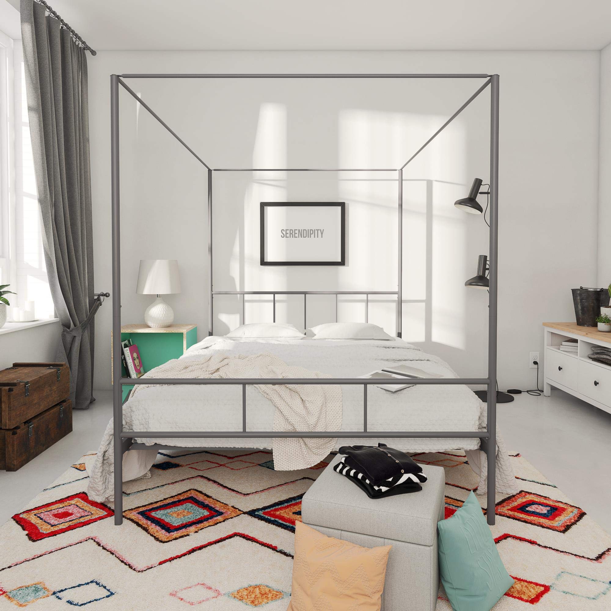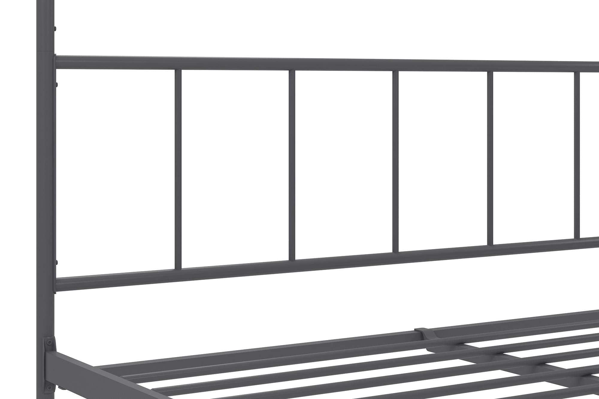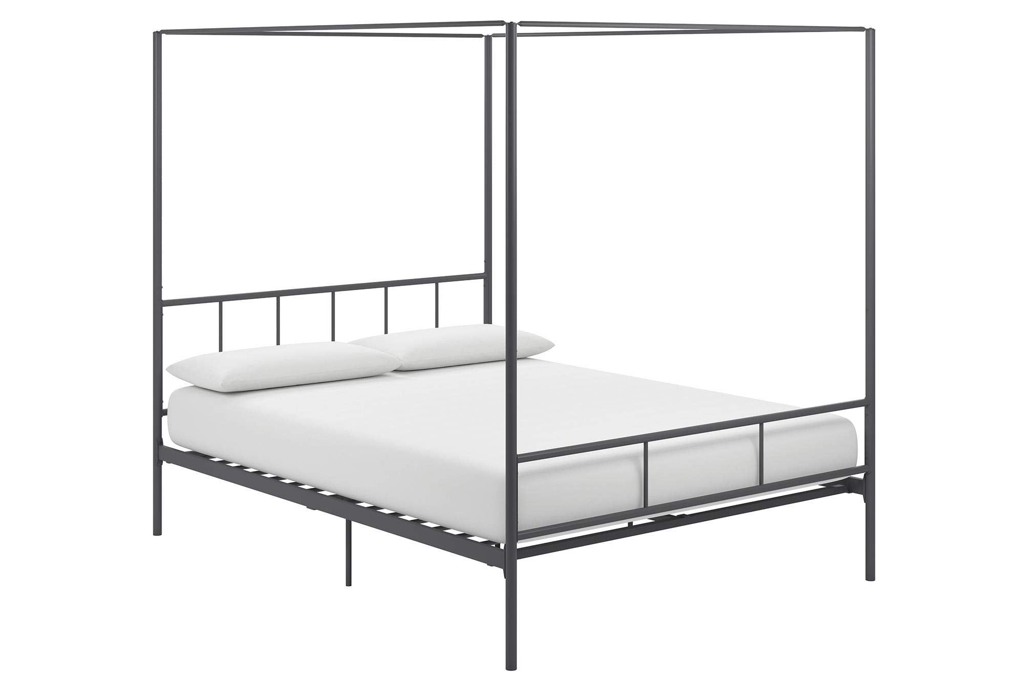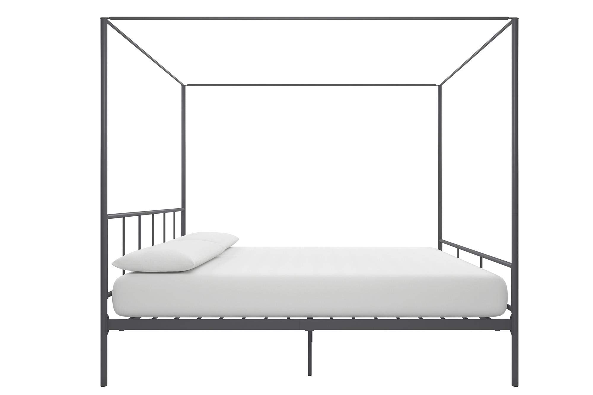 The Novogratz Marion Canopy bed is stylish and classy. Designed with a clean silhouette, this eye-catching piece is crafted in solid and sturdy metal that is stable and durable with secure metal slats that do not require a foundation. It comes with a sophisticated headboard and footboard and with metal side rails and center legs to provide full support and comfort to you and your mattress. The Marion is also practical with 11 inches of clearance beneath the bed, ideal to store things away. Just pair it with the Novogratz Atlas mattress and a comfy duvet and this artfully designed bed frame will become the centerpiece of your room!