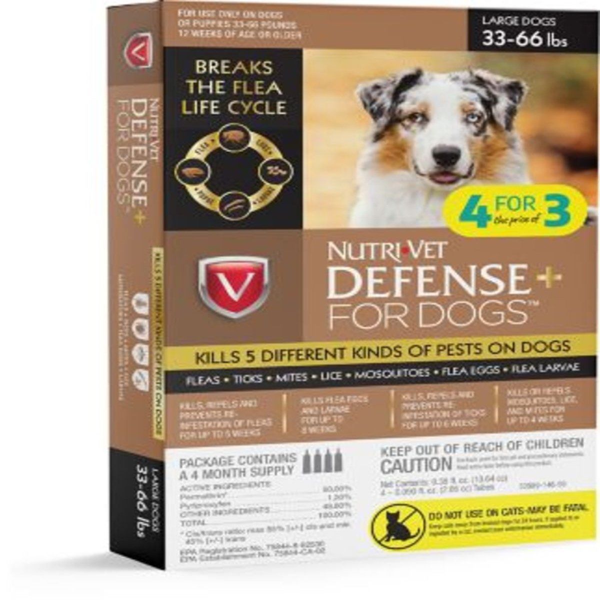 Nutri-Vet Defense Plus Dog Flea and Tick Prevention contains two active ingredients to protect your dog (33-66 lbs) and your home from nasty fleas and ticks. Among the best flea and tick control for dogs this convenient and easy to apply topical dog flea and tick prevention also fights mosquitoes lice and mites to keep your dog safe and itch-free. This dog flea and tick prevention kills five different kinds of pest on dogs. Use the flea and tick treatment for dogs on large dogs 12 weeks of age or older. Protect your dog from flea and tick infestation with this dog flea and tick prevention! Features Large dogs Removes Fleas and Ticks Rub on Pack of 4Specifications Size: Large Dog Weight: 33-66 lbs - SKU: NDPS44806