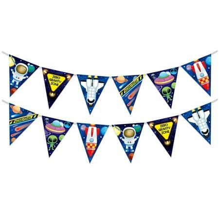 ake your space themed party to the stars with our galaxy birthday party supplies! Our high-quality galaxy party supplies features rocket ships space shuttles and the solar system making it the perfect addition to any space theme party. Made from high-quality materials it s durable and long-lasting ensuring that it can be used for multiple celebrations. The outer space birthday party banner is preassembled and comes pre-strung for easy hanging. Check out our store for more outer space party decorations including backdrops cake toppers balloons and more! This galaxy birthday banner features: Pre-strung pennant banner comes ready for decorating and hanging! (1) pennant banner comes with 12 beautifully designed flats each measures 11.6 x 9.6 inch per pack. All pennant flags are made of coated durable flexible paper so they flutter like butterflies in the wind!