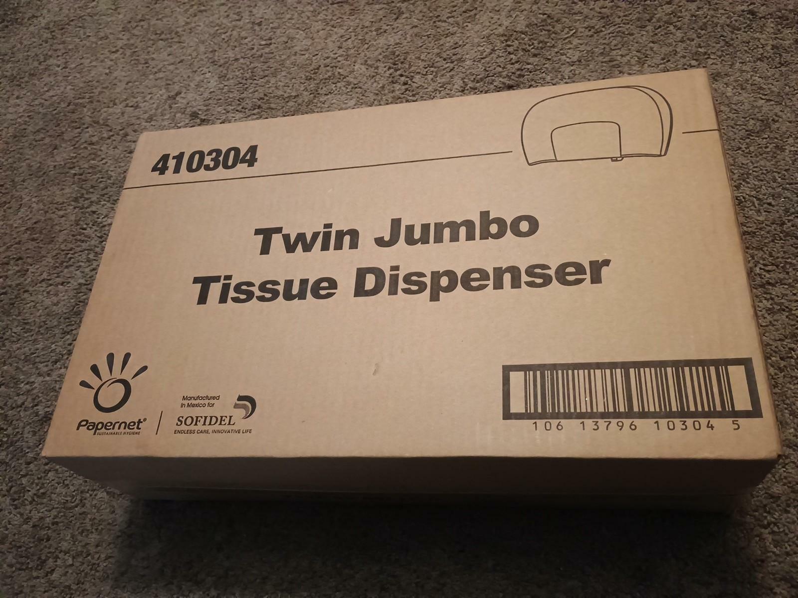The Papernet Sofidel 410304 Twin JUMBO Toilet Paper Tissue Dispenser is a new product designed for commercial restrooms. This dispenser is meant to hold two jumbo-sized rolls of toilet paper, ensuring that restroom users always have a steady supply of tissue available. The dispenser is likely made of durable materials to withstand high-traffic environments and is a practical solution for maintaining restroom cleanliness and hygiene.