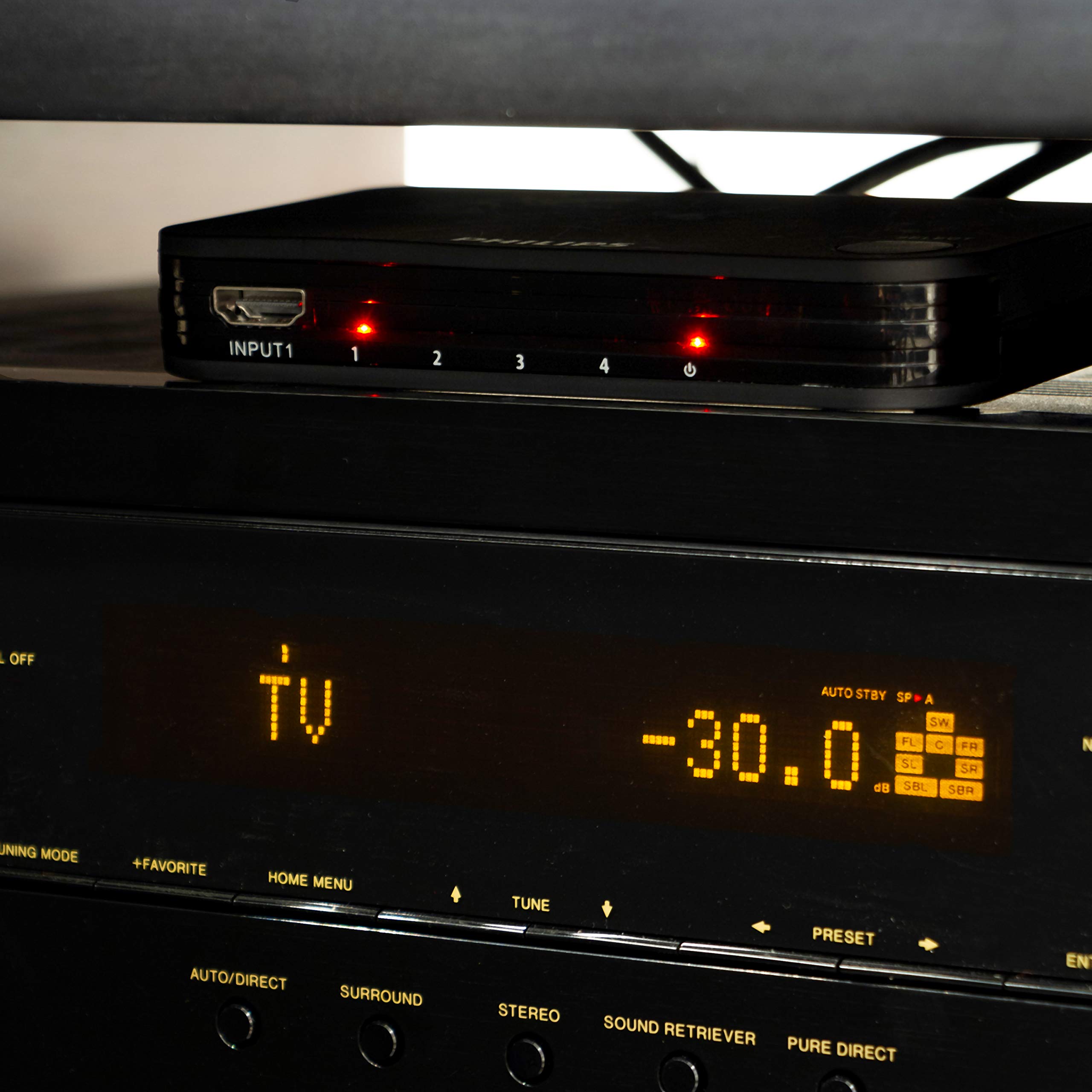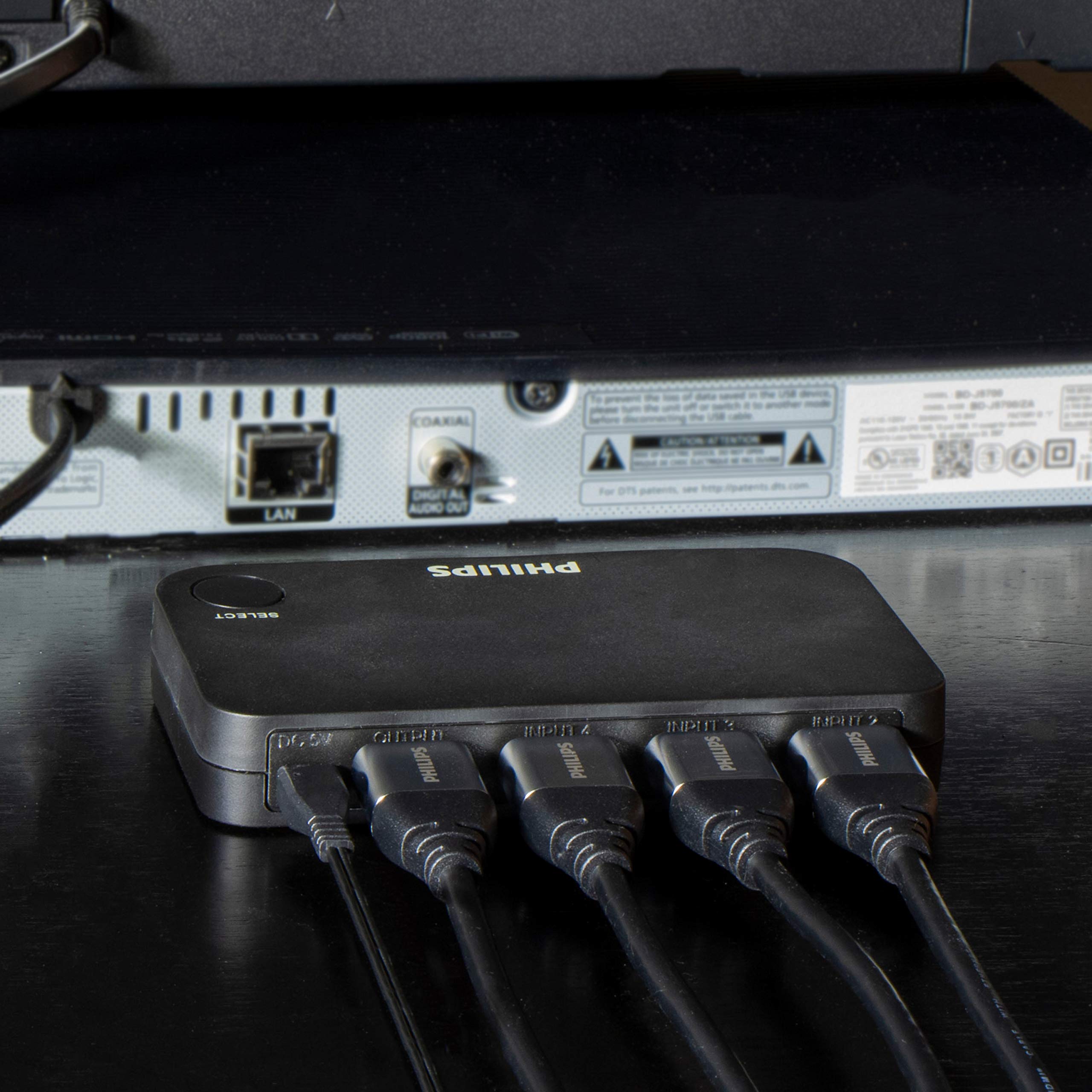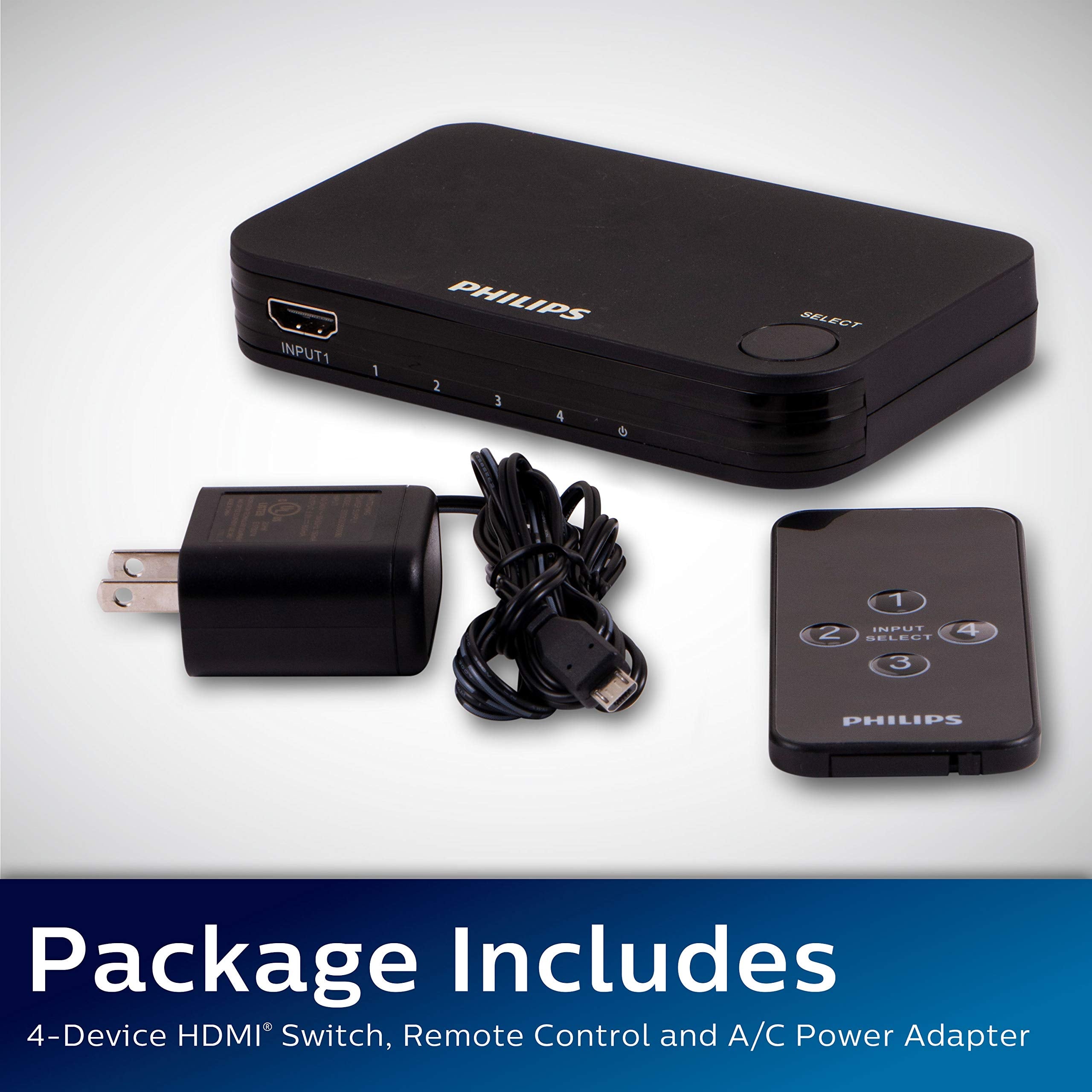 Create the ultimate media experience at home with a Philips Elite 4-Port HDMI Switch with Wireless Remote Control. When you’ve maxed out your TV’s ability to connect to your favorite high-definition devices, the switch instantly turns one of your TV’s HDMI ports into four. This simple connection lets you easily change from one piece of equipment to another by pressing a button on the switch or by using the included wireless remote. Either way, you’ll enjoy the ease of switching devices without the hassle of disconnecting and connecting cables. This compact HDMI device works with all brands of HDMI cables, TVs, Blu-ray™/DVD and streaming media players, cable and satellite boxes, gaming consoles (PS4, PS5, Xbox One, Xbox Series X, etc.) and other devices with an HDMI port. HDMI cables (not included) are required to connect each device to the switch. Additionally, this switch is powered by a standard wall outlet using the included AC adapter. Easy-to-read labels let you know where to connect your equipment, and the switch’s LED lights let you know which connected device is selected for use. Designed for HDTV, this switch is HDCP 2.2 compatible and supports high-resolution video up to 4K@60Hz, 3D and lossless 5.1 & 7.1 surround sound for superior audio and video. Take charge of your home entertainment system with a Philips Elite 4-Port HDMI Switch. Model #SWV9484B/27-991.