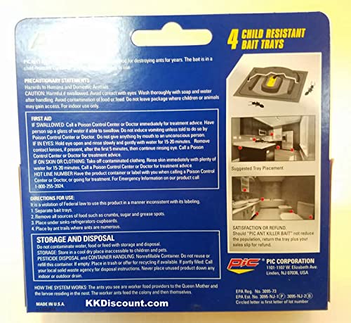 Keeping ants out of the kitchen has never been easier with the plastic ant killing bait stations from PIC. These ant traps work quickly to lure and kill ants but is safe for indoor use and durable enough for outdoor use. The 4 child-resistant baits remove ants and provide peace of mind. For best results, place bait stations along the perimeter of your home or kitchen where ants travel from outdoors to indoors. Placing multiple stations in these areas are suggested. Bait will be retrieved by the worker ants and returned to the colony where the bait kills the colony and queen.