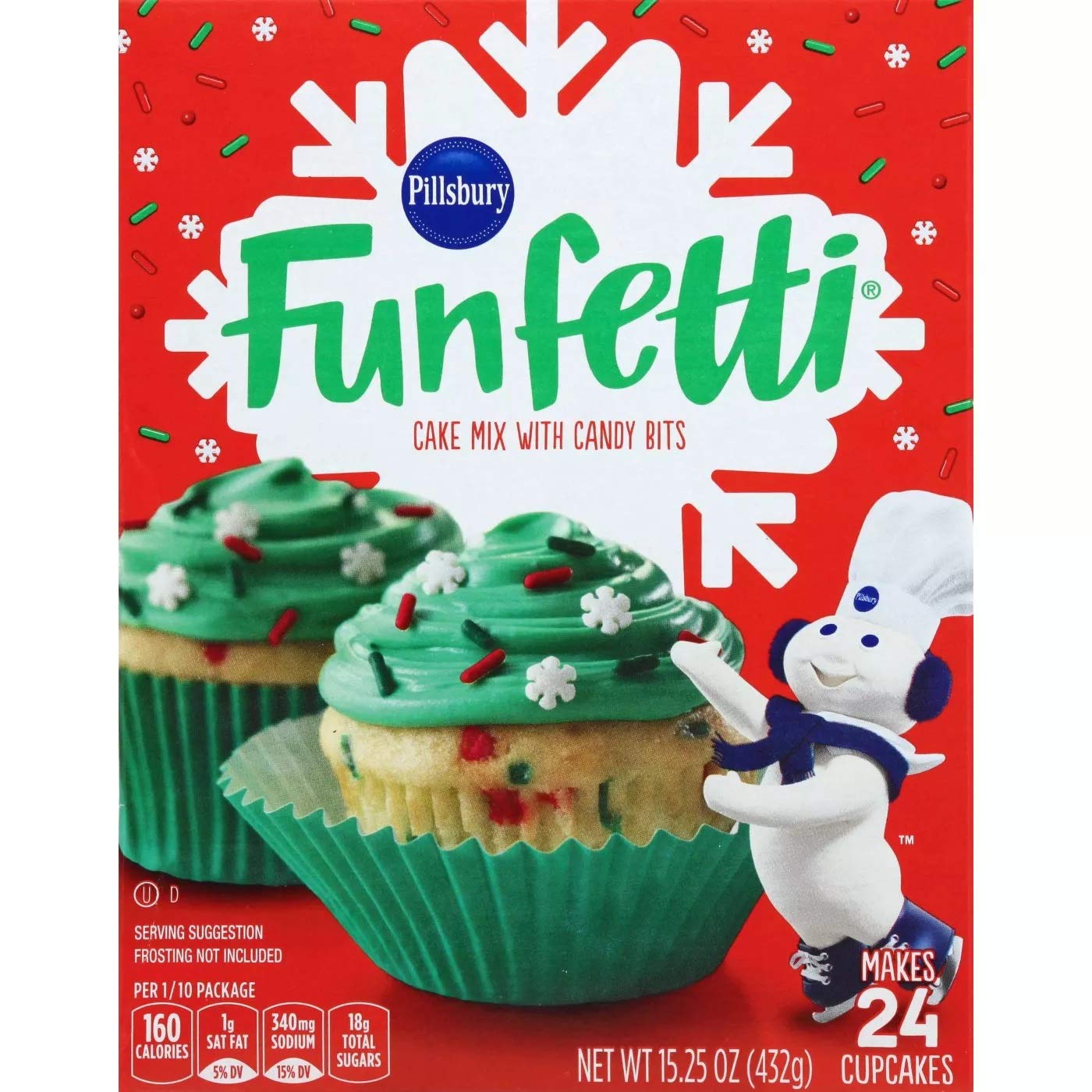 Cake mix with candy bits. Per 1/10 Package: 160 calories; 1 g sat fat (5% DV); 340mg sodium (15% DV); 18 g total sugars. Contains a bioengineered food ingredient. Makes 24 cupcakes. Frosting not included. pillsburybaking.com. Find more fun ideas on: Pinterest. Facebook. Twitter. Questions or comments? 1-800-767-44666. Visit us at pillsburybaking.com. Holiday Snowflake Cookies, Funfetti Color me Holiday Cupmakes. Made with 35% recycled fiber.