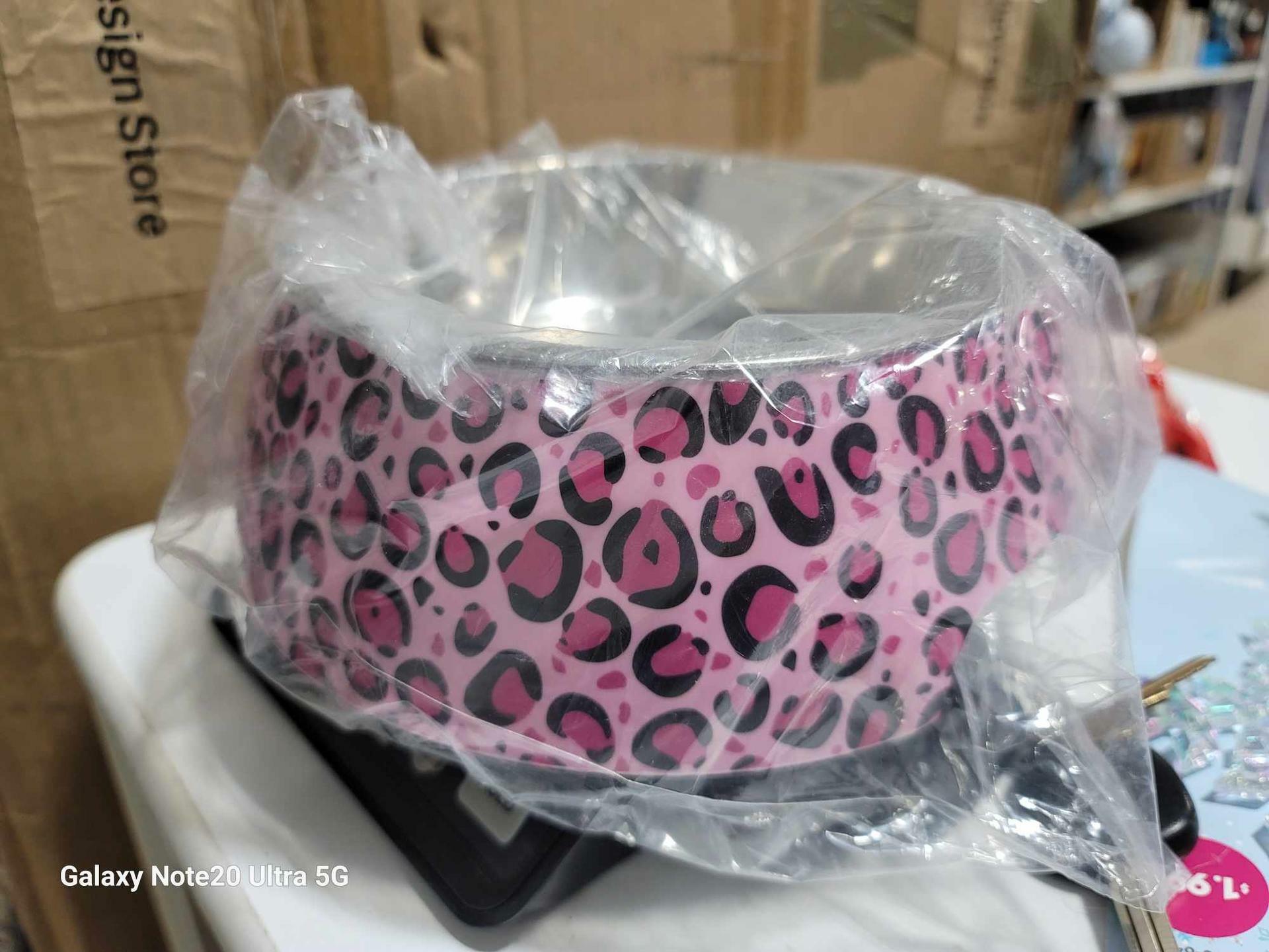 he dog bowl with pink leopard spots is a whimsical yet practical accessory for your furry friend. Crafted to be durable and easily cleaned, it boasts a classic round shape with a smooth, glossy finish. The base color of the bowl is a soft, baby pink, which provides a gentle contrast to the vivid leopard spots scattered across its surface.