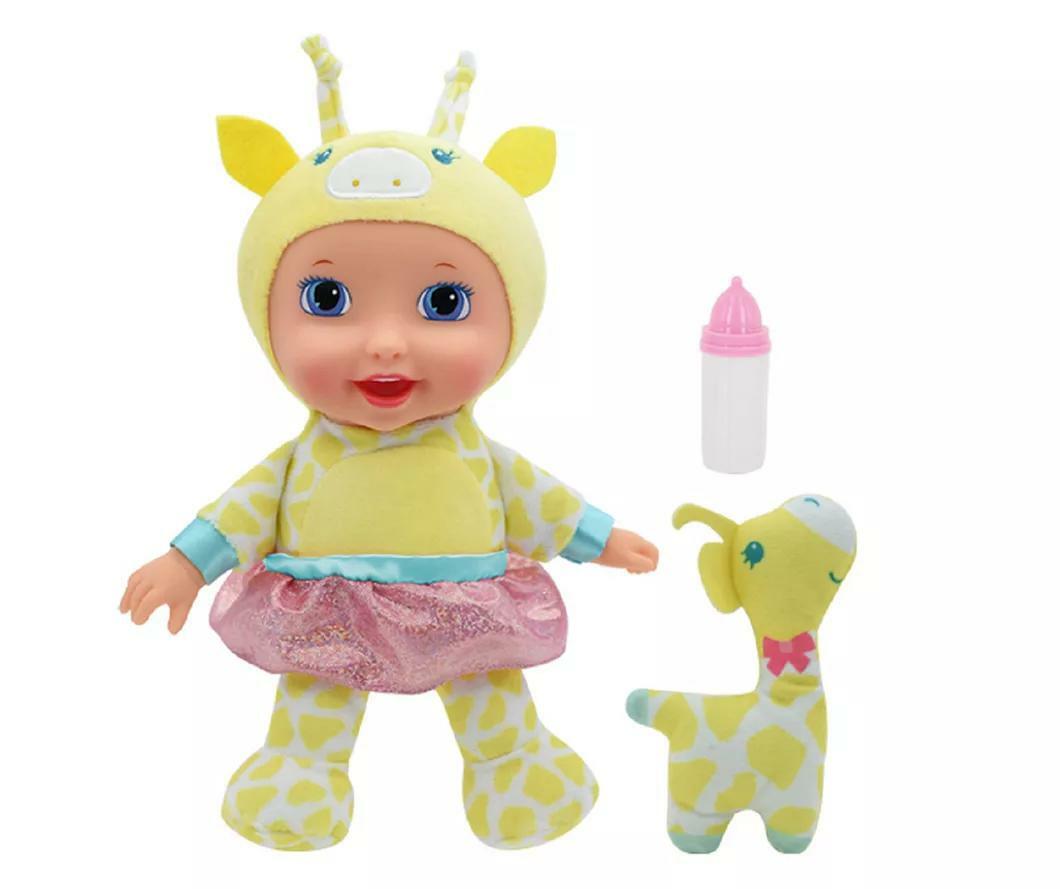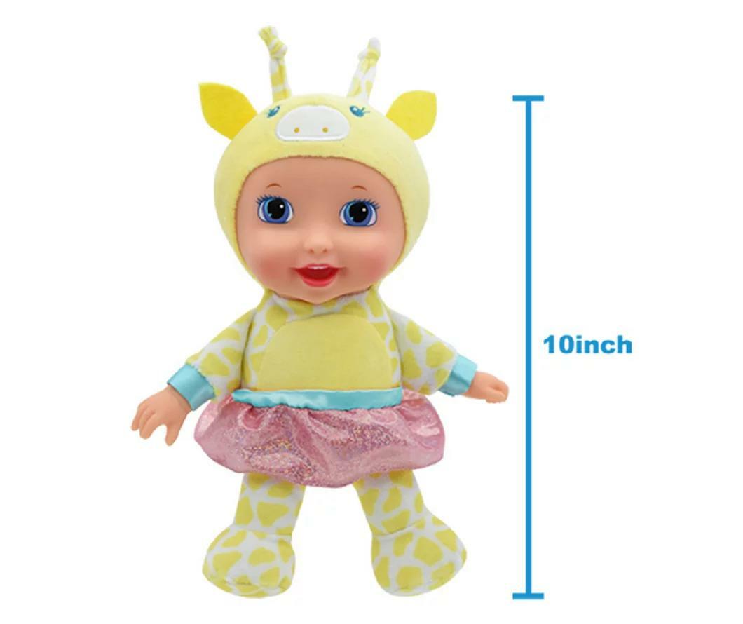 Your little one will want to snuggle up close to this cuddly baby doll. They wear a cute giraffe-themed outfit in yellow with a tutu and matching giraffe toy. Designed it a soft plush body, just press their chest to hear magical sounds.
