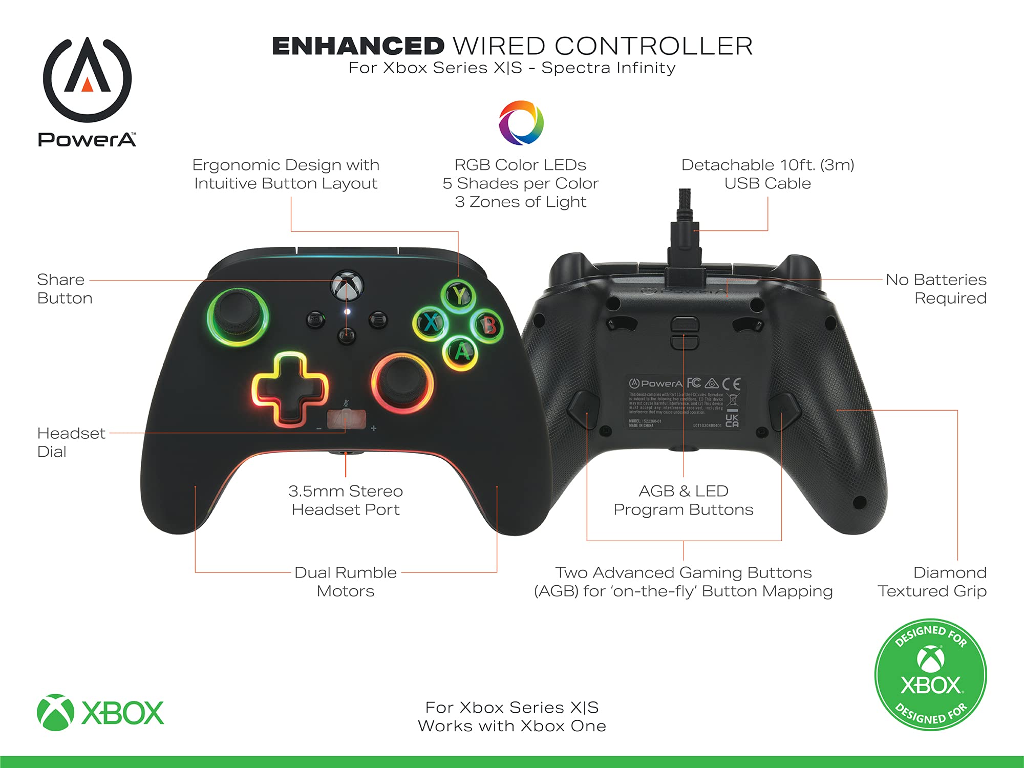 Achieve brilliant gameplay with the amazing PowerA Spectra Infinity Enhanced Wired Controller for Xbox Series X/S. Officially licensed.This is an open box item. Box may have some damage.