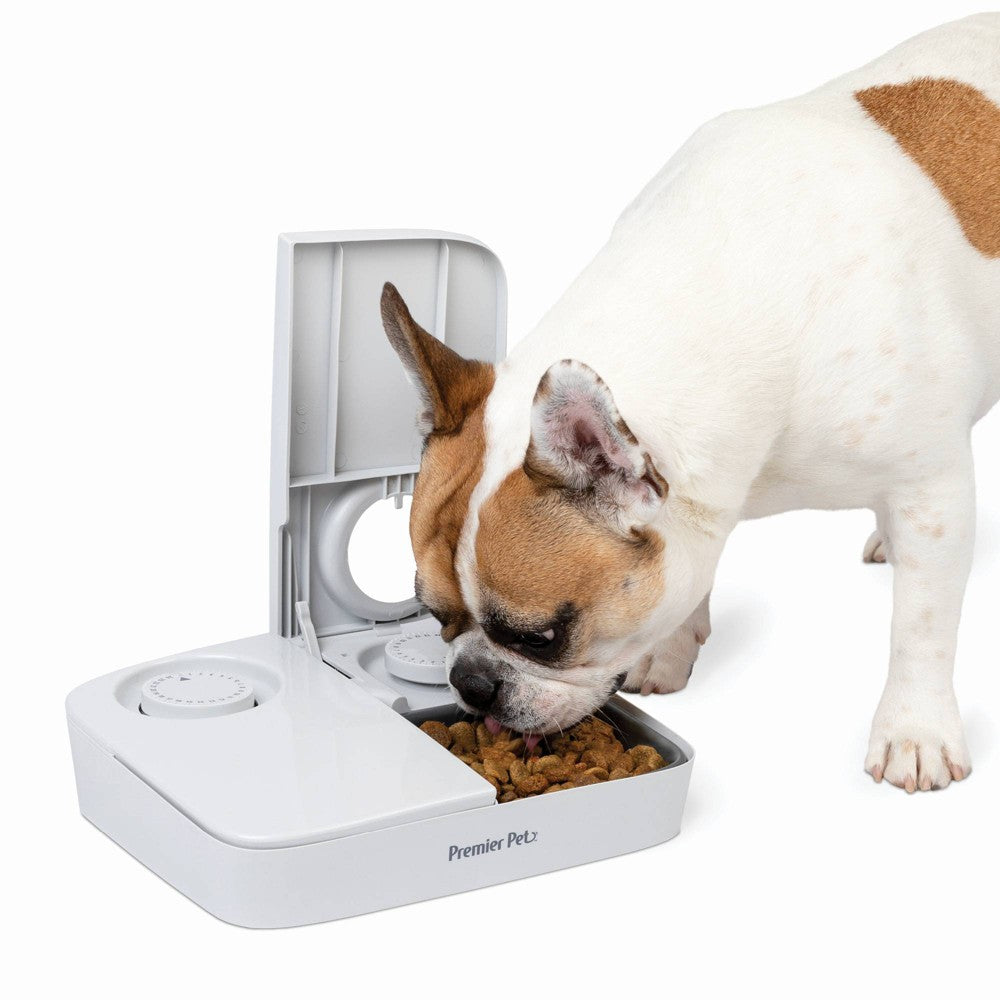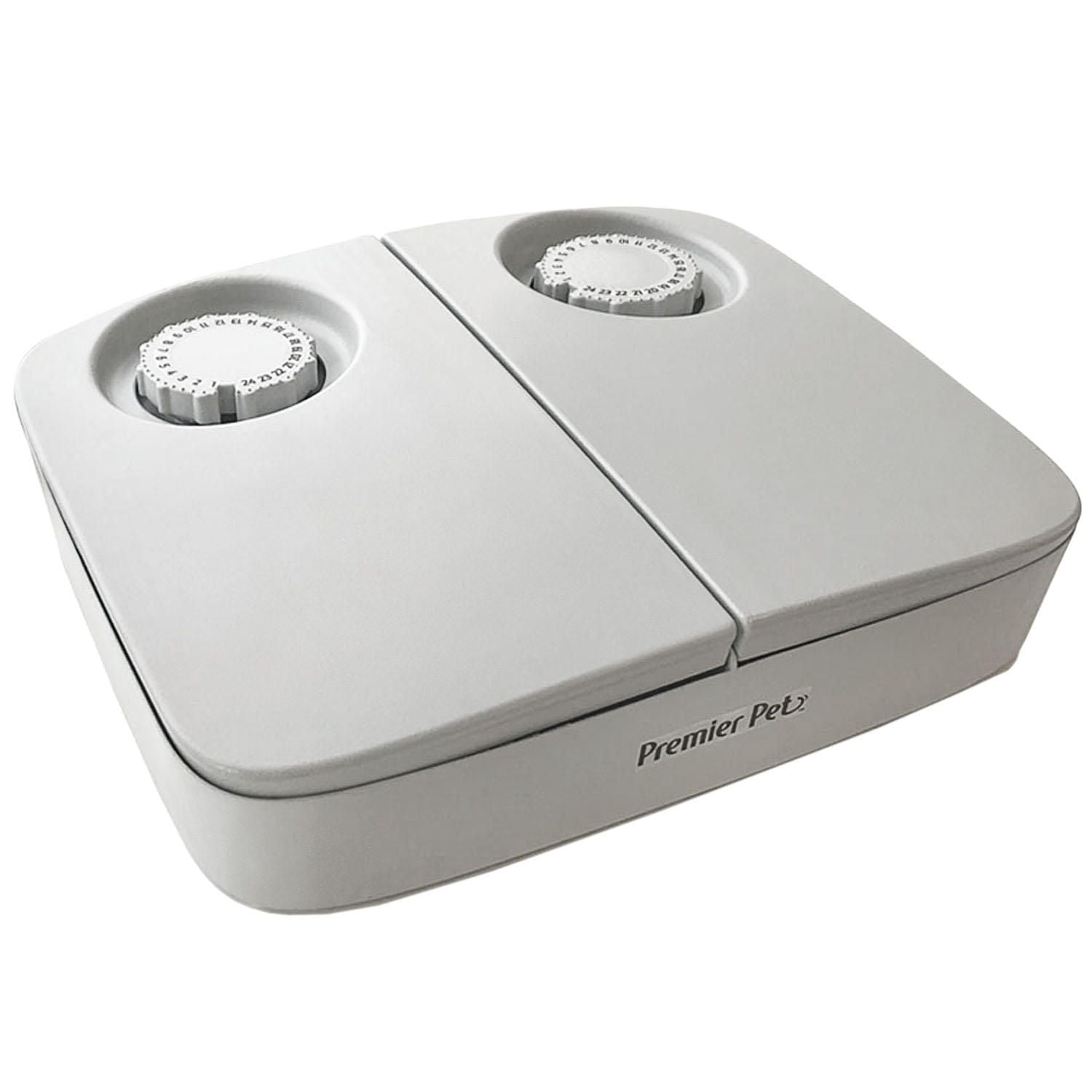 The Premier Pet Automatic Timer Pet Feeder - 2 Meal- This provides a convenient and healthy solution to feed your pet 2 pre-portioned meals within a 24-hour period. You have the option of feeding with dry or semi-moist food and up to 1 1/2 cups per meal. The simple-to-use timer design and tamper-resistant lids help control your pet s weight and establish a healthy eating routine when you re busy or away from home.