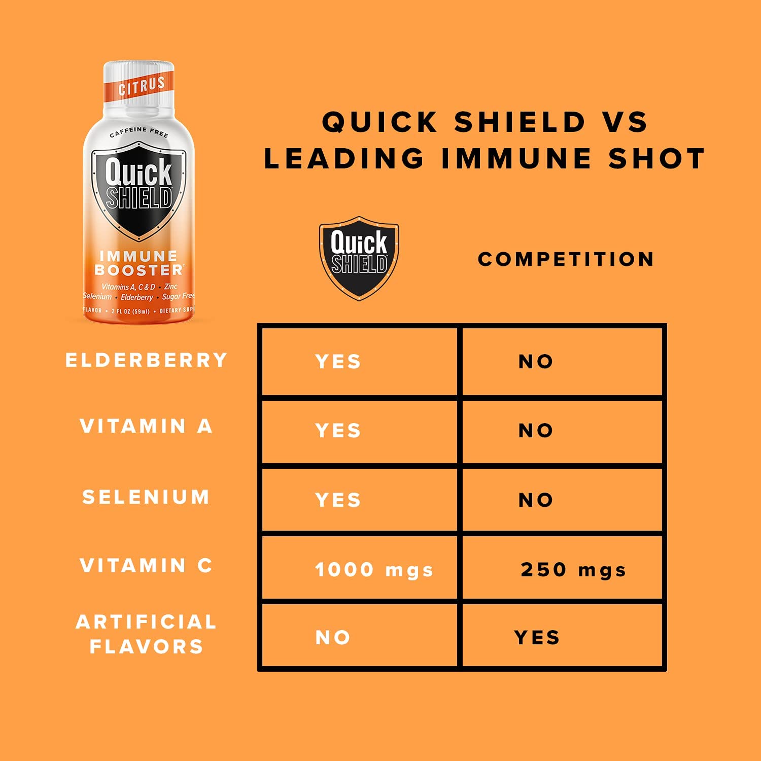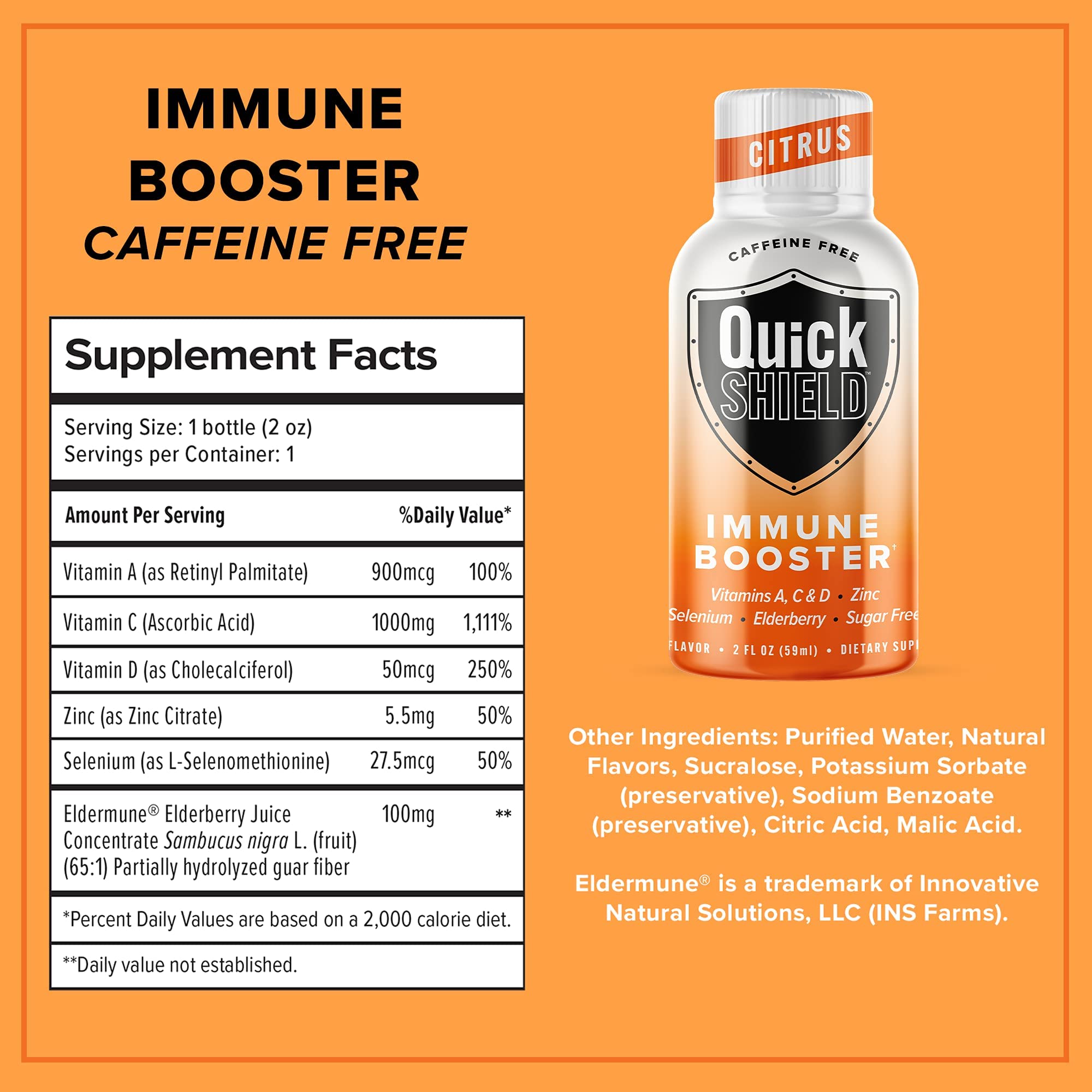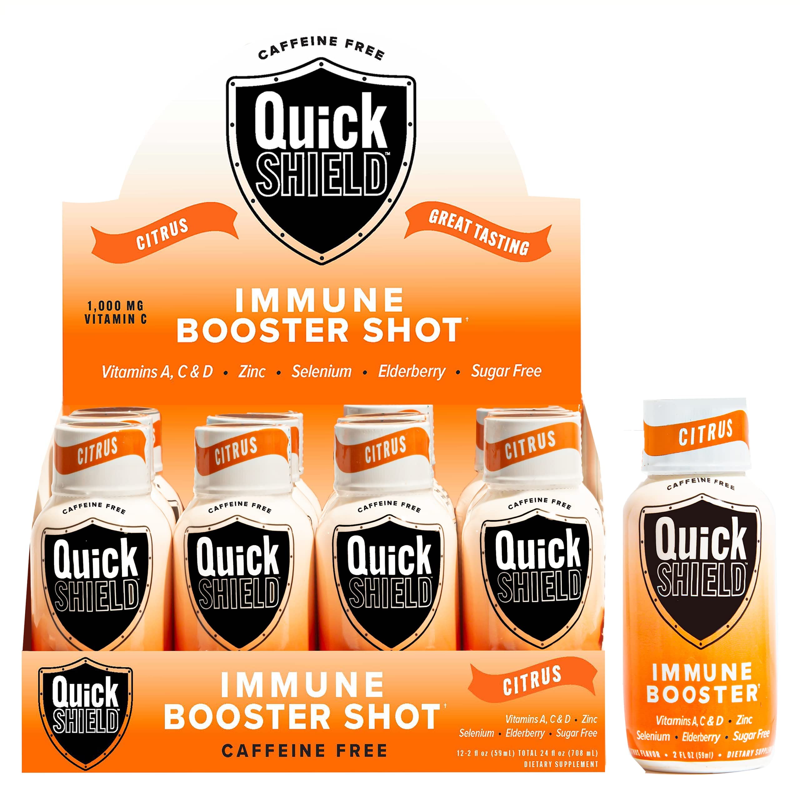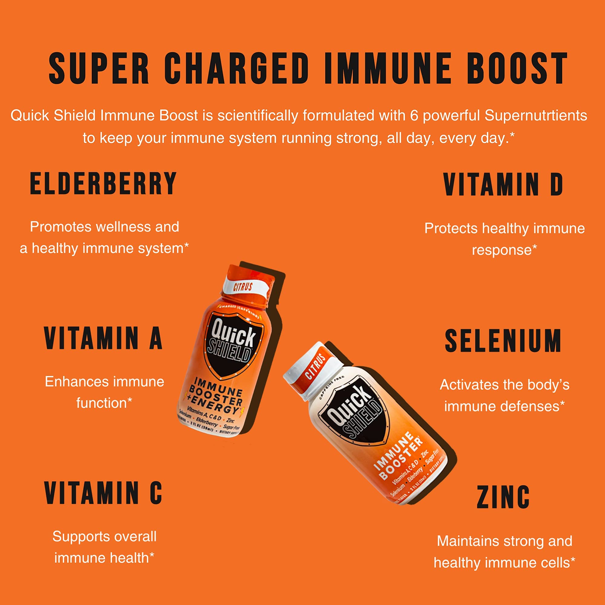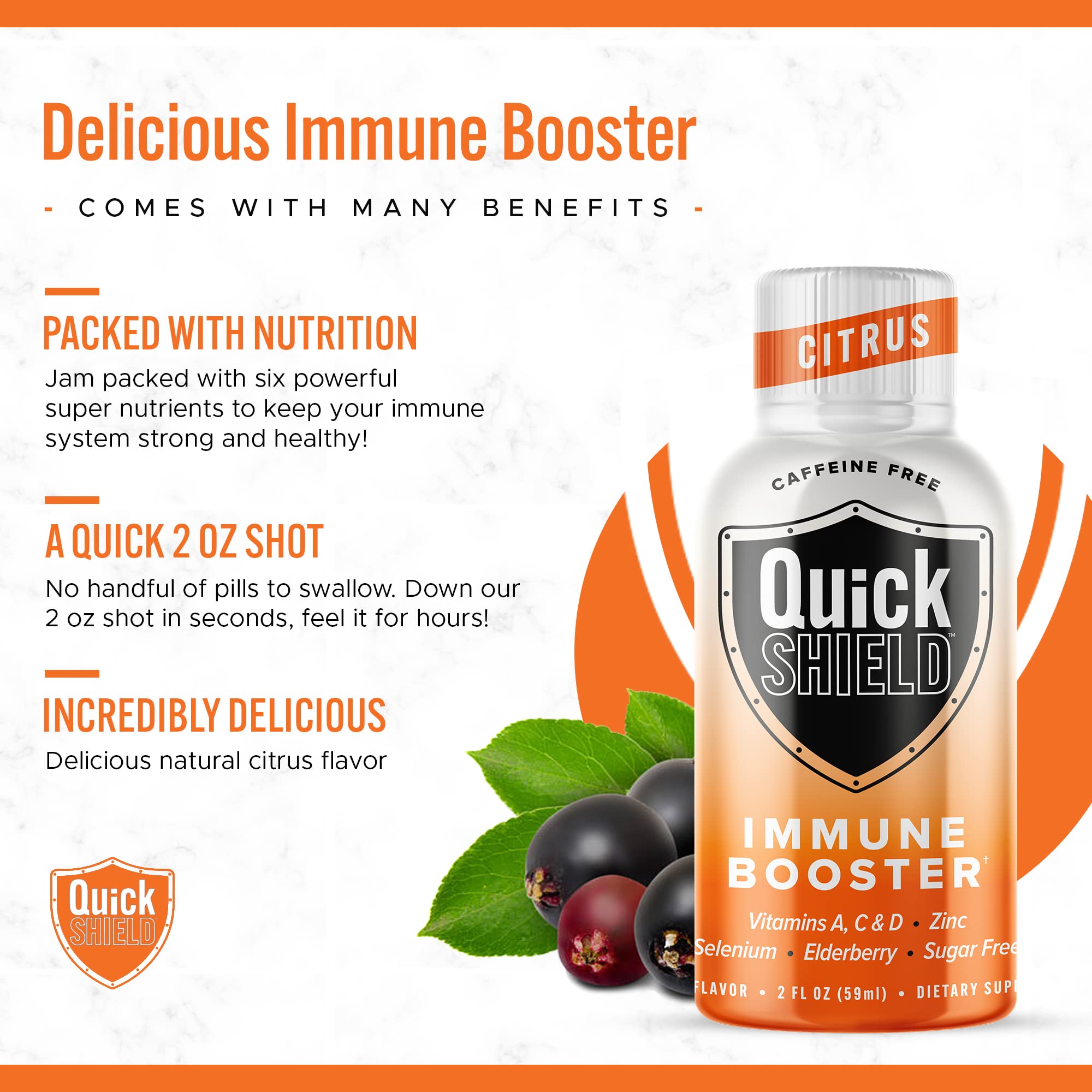 Give Yourself A Shot Of Energy & Step Up Your Immune Defense With Quick Shield Immune Boost Shots! Quick Shield immune booster drinks are packed with a carefully balanced blend of super nutrients to help provide your body the vitamins, minerals, and powerful antioxidants it needs to support your immune system and lifestyle. Our immune system support shots are vegetarian friendly, made with pure ingredients, and non-GMO with no sugar, no soy, and no dairy to help support your immune functions and provide a clean boost of energy without any jitters. Everyday Immune & Energy Support In A Bottle This immune booster shot pack combines Elderberries, 1000mg Vitamin C, Vitamins A & D, Selenium, and Zinc to pump up your immune system and maintain normal functions and response along with promoting your overall wellbeing. Thanks to the convenient size, you can take the energy shots with you anywhere you go making them ideal for use at home, office, traveling, gym, hiking, and more! Just open, chug, and enjoy so you can easily make them a part of your everyday life. Features You’ll Love: Tastes Delicious, easy to take, Down it in seconds, feel it for hours! - No artificial flavors, colors, dairy or soy ingredients - No sugar and no calories so you can seamlessly integrate them into any diet - Loaded with Vitamins, Minerals, Antioxidants, and much more - Formulated with the everyday needs of both women and men in mind - Helps you stay active and focused all day while being gentle on your digestion Give Your Body The Support It Needs With Quick Shield Immune Booster Shots!