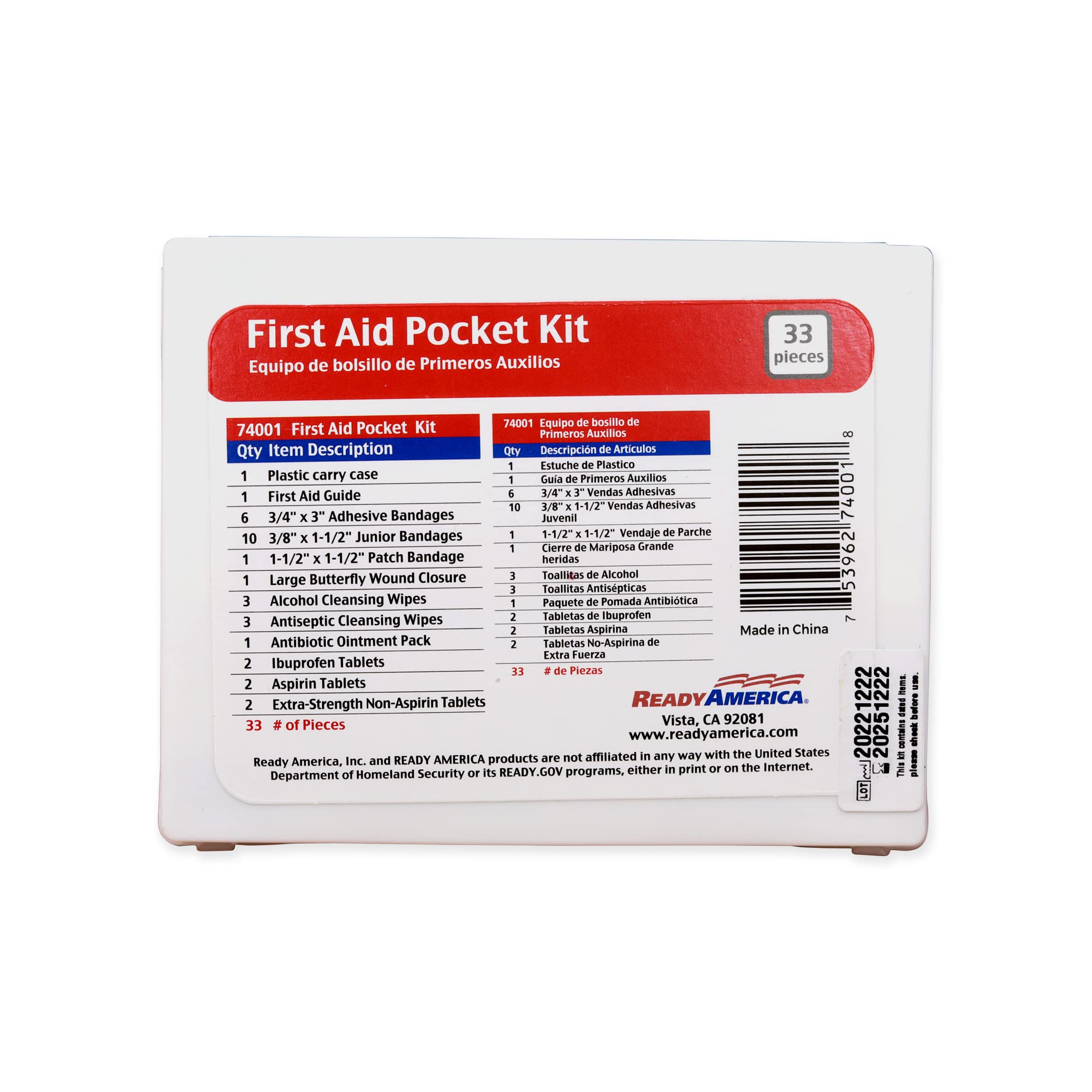 Product Description Basic Survival Kit From the Manufacturer Each kit contains enough emergency supplies to sustain two people for three days, as recommended by the American Red Cross. There's food, water, and emergency blankets, plus a 33-piece First Aid kit, two 12-hour safety light sticks, dust masks, nitrile gloves, and an emergency whistle. Each kit also contains emergency ponchos and pocket tissues. The kit, in a handy backpack, can be stored at home, at school, or at the office.Is missing original tags. All items insides are .
