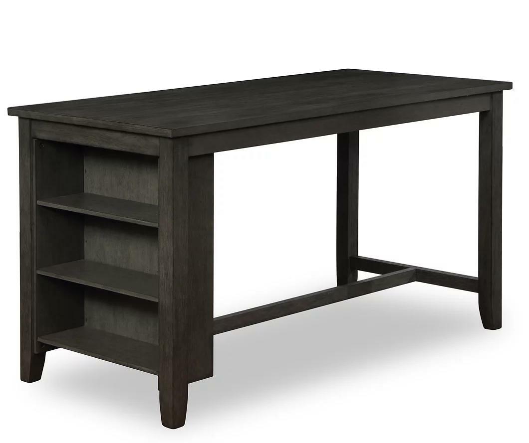 Serve up high style in your home or apartment entertaining with the Raleigh pub table. Clean-lined silhouette, made from Acacia veneer and solids, is finished in an antique color for added casual design. Convenient side storage shelves let you keep dining essentials nearby.This item is the store display.