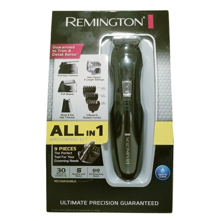 Remington 9-Piece All-In-1 Grooming Kit PG6017 - Detail Trimmer Hair Clippers 9 Pieces: The perfect tool for your grooming needs. Rechargeable: 30 minutes of cordless use. (NA Plug) Stainless steel self-sharpening blades. Includes charging stand. Easy to clean! ULTIMATE PRECISION Stainless steel blades are razor sharp and perfectly angled for clear visibility of the cutting edge while trimming. COMPLETE CONTROL Trim with confidence: High profile grips and gently curved handle fit firmly and comfortably in your hand for accurate control in any position. FULL SIZE TRIMMER Trim and clean-up sideburns neckline and facial hair. FOIL SHAVER Quickly and comfortably shave close to the skin. NOSE & EAR HAIR TRIMMER Safely remove unwanted hair with no pulling. BEARD & STUBBLE COMBS Trim and maintain a perfectly even beard or 3-day stubble. HAIR CLIPPER Cut and style hair to any desired look. Cutting System: Stainless steel blades - Sharp and long-lasting. Self-sharpening blades - Start sharp stay sharp. Power sys