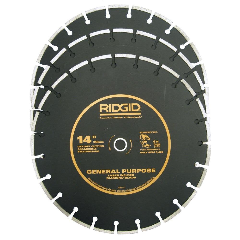 RIDGID General Purpose Diamond Blades are manufactured with the contractor in mind. Laser welded segments provide fast and aggressive cutting on concrete, brick, block and pavers. Use this blade on 14 in. high-speed power saws, masonry saws, and low-horsepower walk-behind saws with 1 in. arbor, 20 mm adapter included.