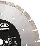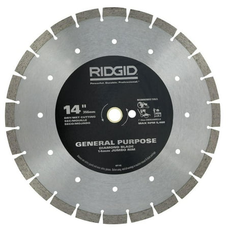14 In. Segmented High-Rim Diamond Blade Great for cutting pavers block brick and concrete Segmented rim dispels dust and debris for clean cuts Ideal for professional contractor use RIDGID 14 mm Jumbo Segmented Diamond Blades are manufactured with the contractor in mind. These blades are engineered for maximum cutting performance and extra-long life. The Segmented rim design with 14 mm Jumbo sized segments provide fast and consistent cutting of brick block pavers and cured concrete. Use this blade on 14 in. masonry saws high-speed power saws and low-horsepower walk-behind saws with 1 in. arbor 20 mm adapter included. Blade Diameter (in.): 14 Number in Package: 1 Teeth Per Inch: 0 Blade Type: Diamond : 90-Day Tools Product Type: Power Tool Power Tool Accessory Type: Circular Saw Blade Color Family: Black Rim Type: Segmented Tool Type: Saw Blade Saw Blade Material: Diamond Material Cut: Multi-Purpose Ideally Used With: Cut-Off Saws Blade Diameter: 14 Diameter (in.): 14 in