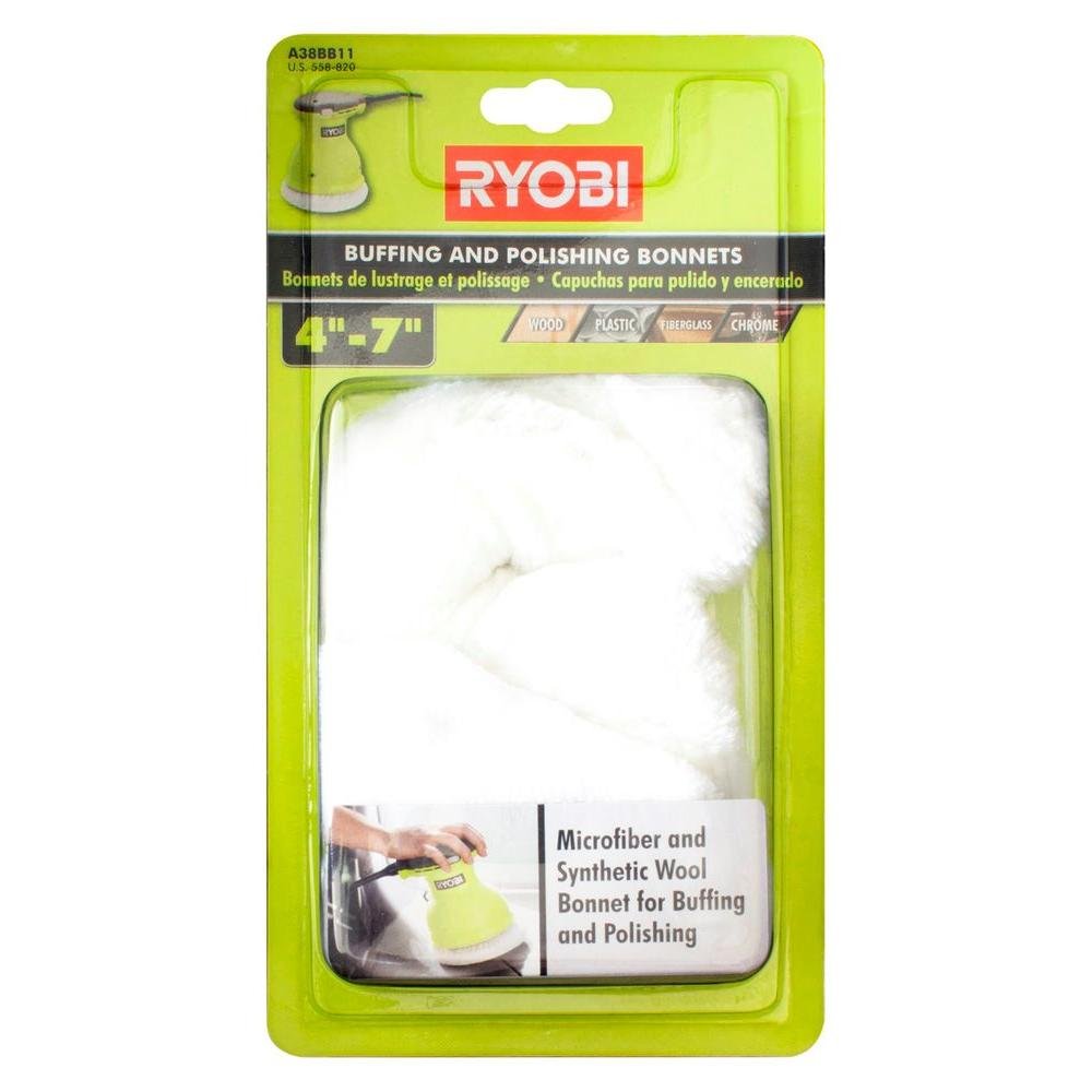 Get the most out of your buffer with Ryobi. This twin pack of bonnets will remove and apply wax and provide you with an even, steady polish over a variety of materials. Theyre reusable, too, able to be washed multiple times and air dried to be good as new. To use, simply pull the elastic over whichever Ryobi (or other brand) orbital buffer you may use that accepts 4-7 inch bonnets. For tougher jobs, use the synthetic wool, and for delicate jobs, use the microfiber. With Ryobi, youre sure to make your surfaces shine.