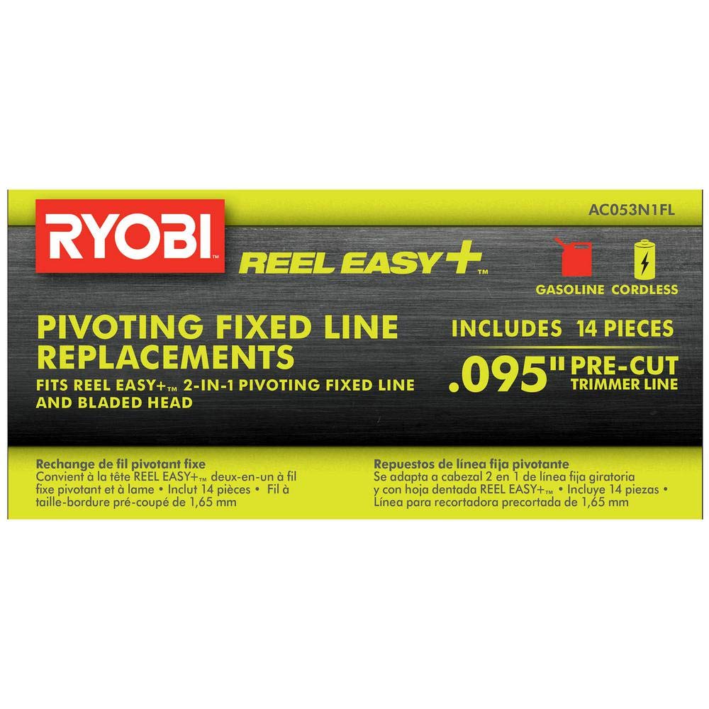 Need replacement fixed trimmer line for Ryobi AC053N1FH 2 in 1 head? These Ryobi Pivoting Fixed Line Replacements are an excellent option. They are .095 Inch and are precut for quick changing. 14 replacements are included with this product. Be ready for easy string trimmer replacement with the help of these Ryobi AC053N1FL fixed line replacements.