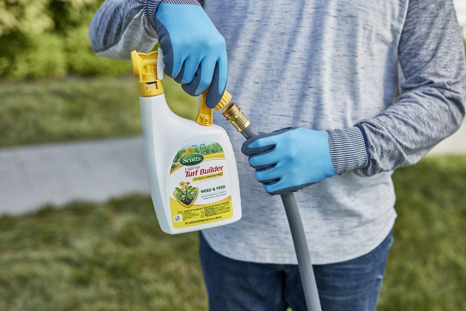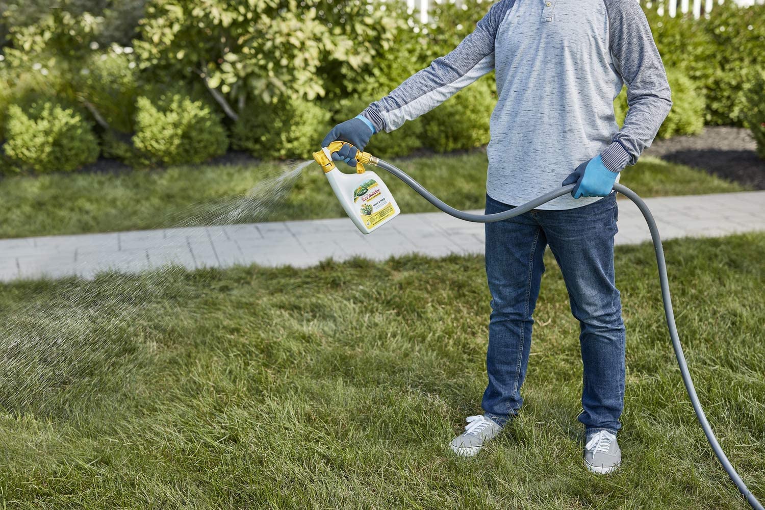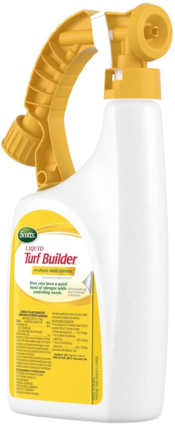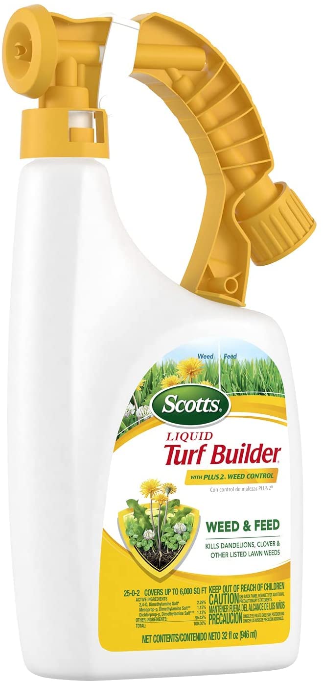 32 oz. ready to spray Feeds up to 5000 square feet Analysis: 25-0-2 Gives your lawn a quick boost of nitrogen while controlling weeds Kills dandelions, clover and other major lawn weeds Easy to use, just attach hose and spray, no spreader needed.