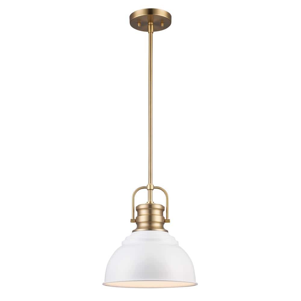 The Shelston pendant from Monteux presents industrial style indoor lighting with farmhouse appeal, ideal for a variety of home styles from traditional to contemporary. Enhance your entryway, kitchen or dining room with the updated styling of the Shelston family of ceiling lights. The 10 in. round pendant is the smallest hanging light in the collection and features a trendy 2-toned finish. A white metal shade contrasts beautifully with the metallic brass hardware for a color combination that is both chic and eye-catching, designed to stand out and showcase your home's interior decor. The domed shade is open at the bottom to allow ample illumination from the 60-Watt bulb inside. The piece mounts to a brass ceiling canopy and includes several matching brass extension rods for a customizable height. Shop the Shelston Collection for additional sizes and finish options.