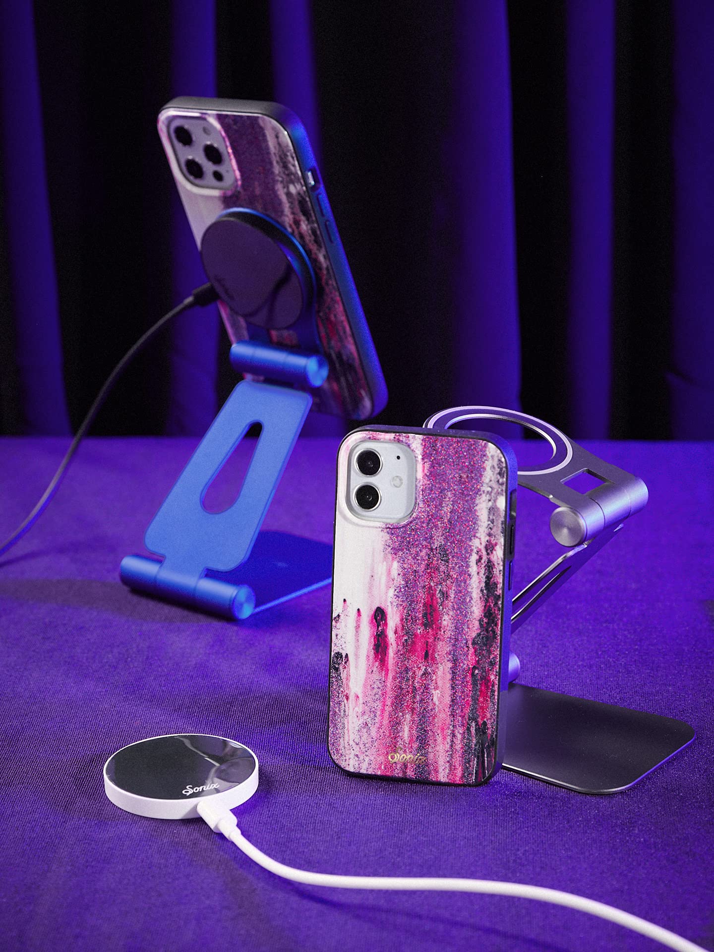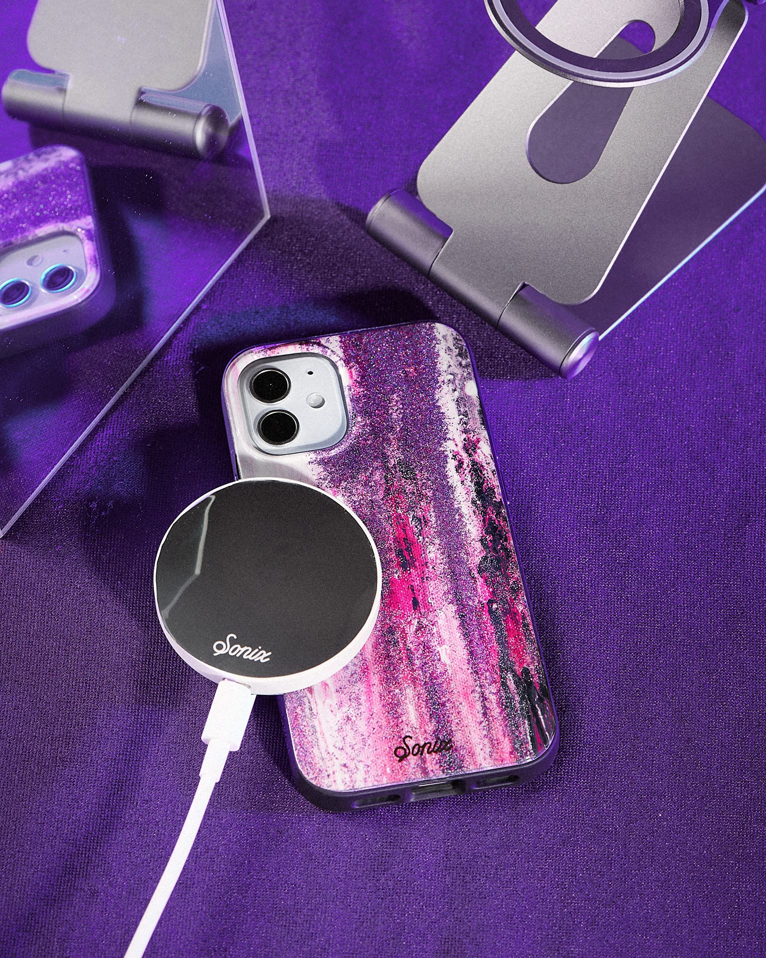 Purple Rain, MagSafe iPhone 12 Pro case features a blend of pink and purple brush strokes with purple glitter to finish. Pretty & Bold. Grooved impact resistant corners for added protection, Raised bumper around camera hole. Featuring Sonixs statement-making print design with foil details, Sleek, Lightweight case, 10 ft. drop protection, Scratch-resistant protective coating, raised shock-absorbent sides for full 360 protection, Includes Sonix Limited Lifetime Warranty. How to use: Designed for Bondir Magnetic Link, Wireless Charger and Apple, Inc. MagSafe charger. If using Bondir Magnetic Link, Wireless Charger: Connect the USB-A or USB-C connector to your own USB-A adapter or The Box, USB-C adapter and plug into power source. Align disk with center-back of iPhone to charge (with phone case on is optional). If using MagSafe charger: Connect the USB-C connector to a recommended 20W power adapter and plug into power source. Align disk with center-back of iPhone to charge (with phone case on is optional). MagSafe is a registered trademark of Apple, Inc. BySonix, Inc. and SONIX products are not sponsored by or associated or affiliated with Apple, Inc.