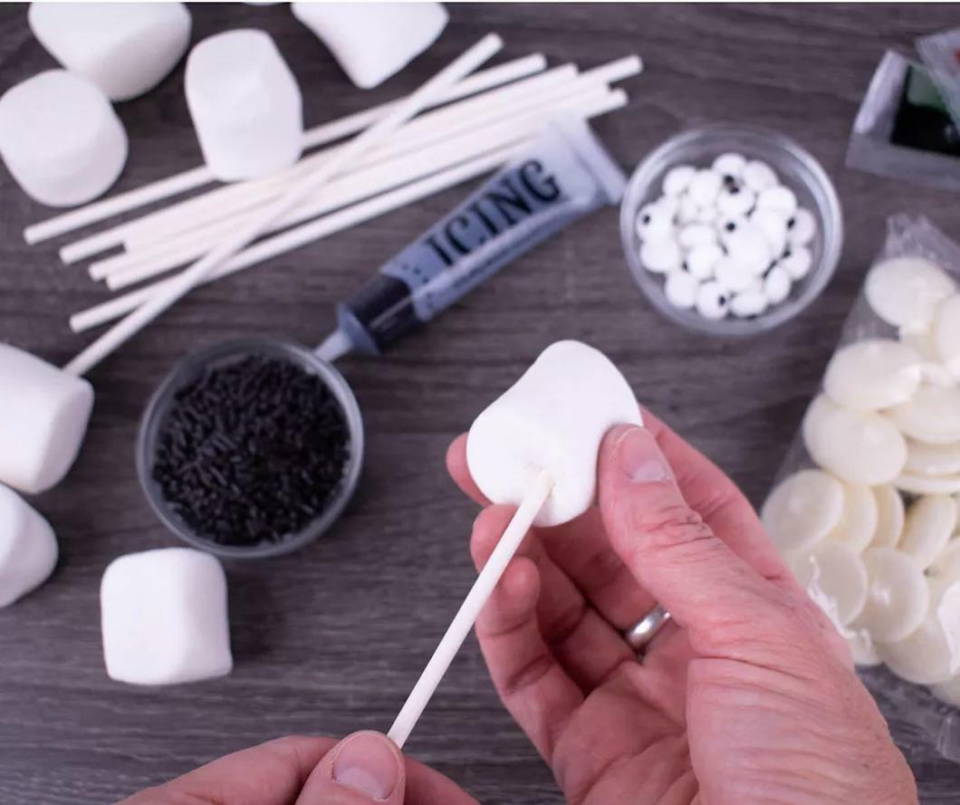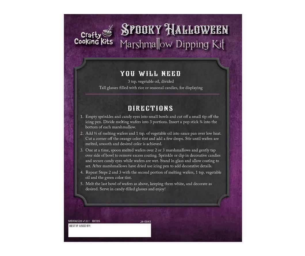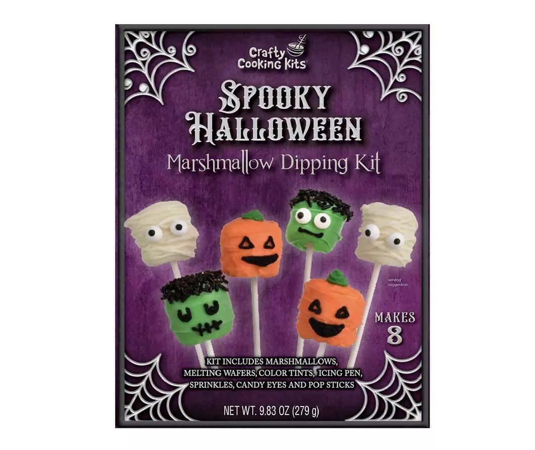 Create some eerie fun with this Halloween marshmallow dipping kit. Create eight different spooky treats! We make it easy and include everything you need – marshmallows, white candy wafers with green and orange color tints for melting, marshmallow pop sticks, a black icing pen and black sprinkles for decorating, and candy eyes for that perfect finish. Happy Halloween!