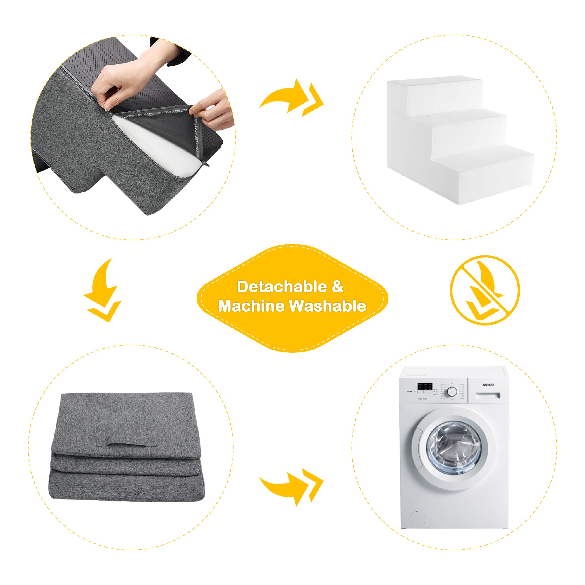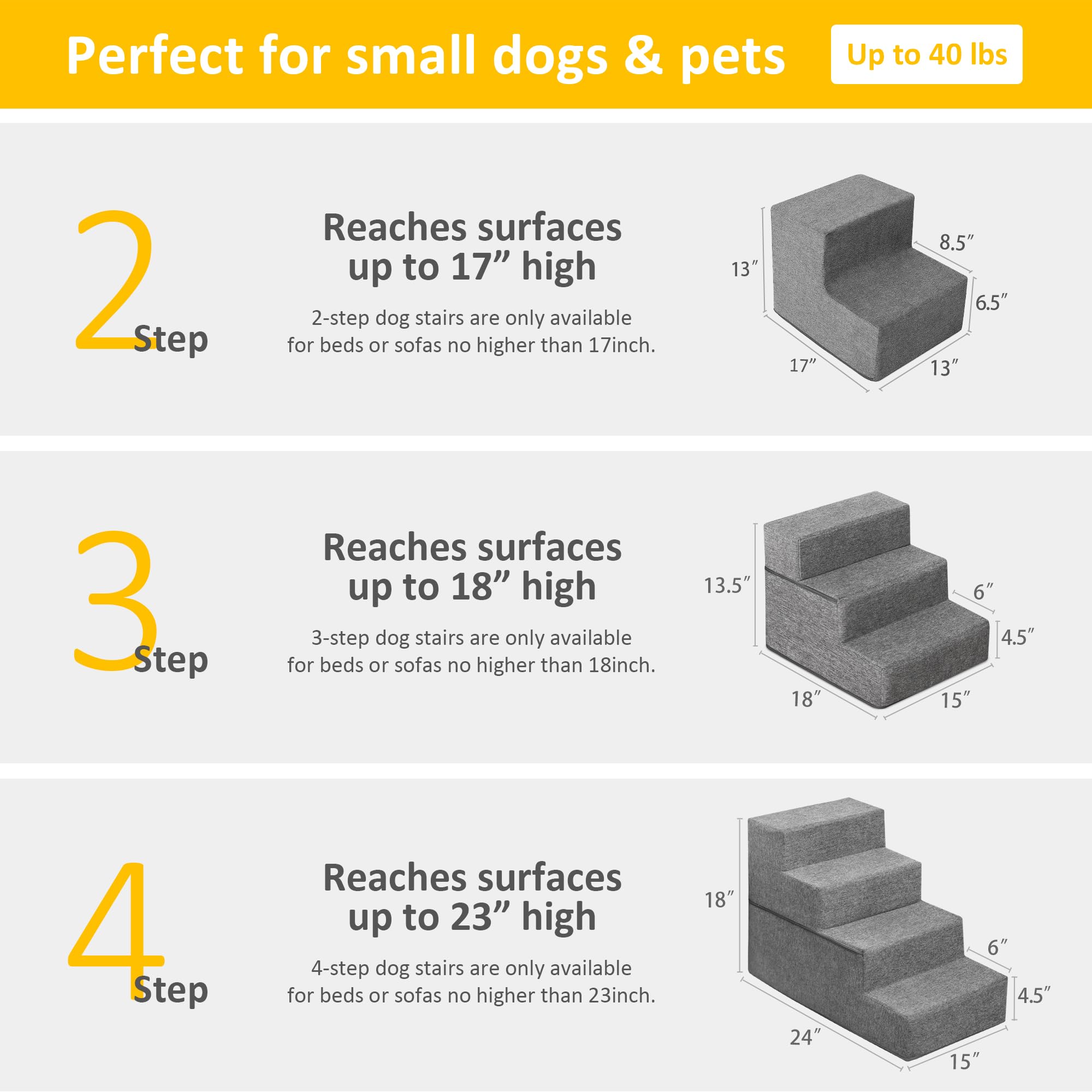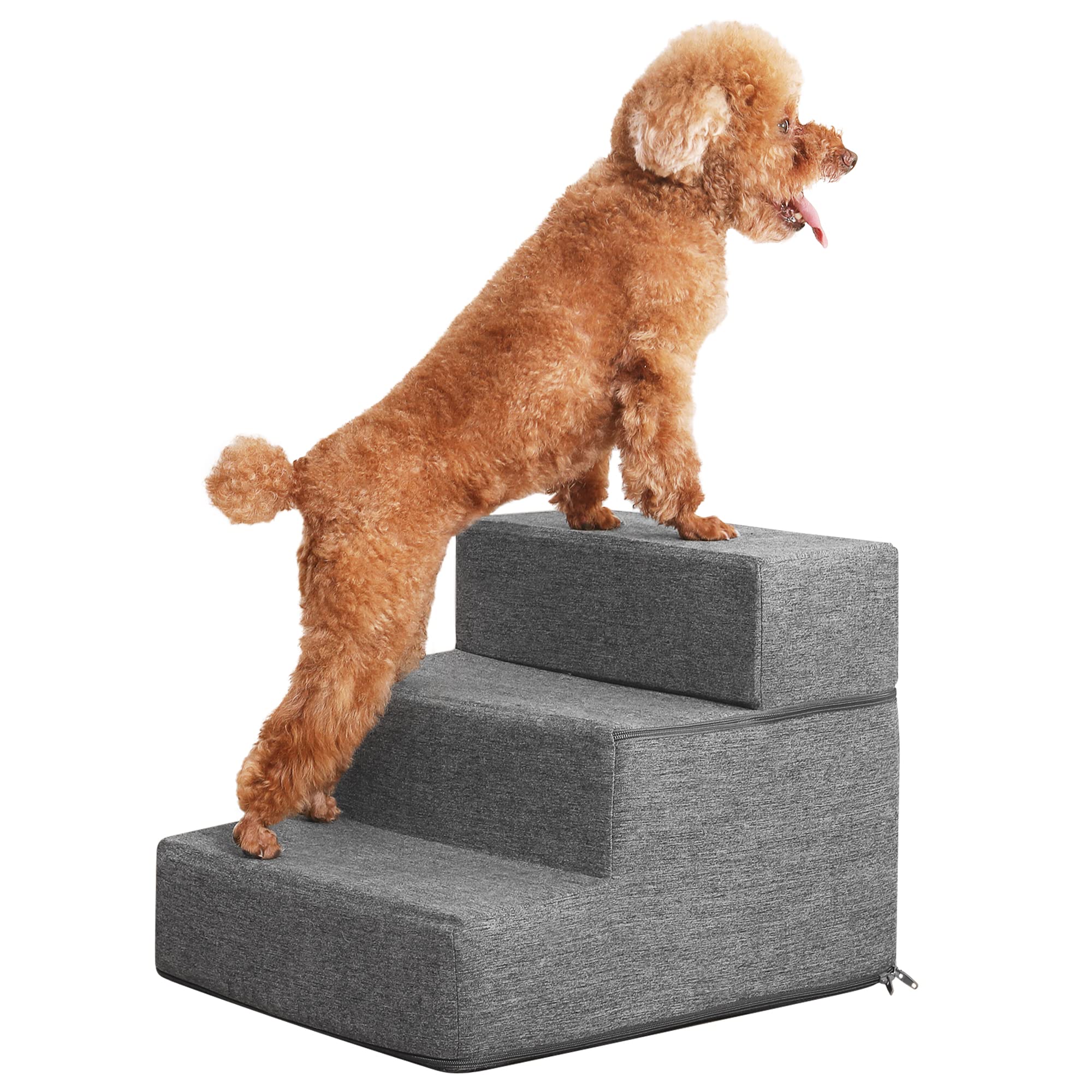 Sted pet stairs 3 steps is the must-have for small and medium sized dogs and all cats. Constructed with high-density foam, it offers a comfortable tread for delicate paws. Pet stairs grey faux linen cover is resistant to wear and dirt so to cut down washes and prolong service life. 3-step dog stairs as high as 13 inches is perfect for injured and older small dogs and cats to reach couch sofa and bed. To offer sufficient support to the paws, we put in as thick as 0.2 inch high-density board so the dog steps hold up well no matter how hard your pets play or chase. The rubber dots underneath the bottom of the pet stairs increase friction and grip on the floor to prevent slides. To make pet steps more portable, we design a handle so that it can be easily moved around. The pet stairs cover is machine washable. Do not machine wash the foam. Sted 3 Steps Pet Stairs Dimensions: L18" x W15" x H13.5"