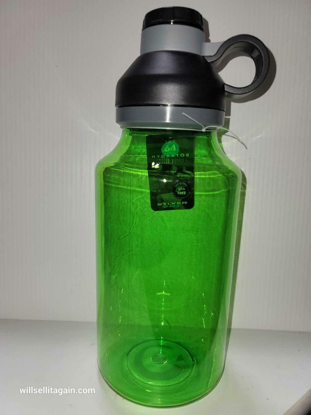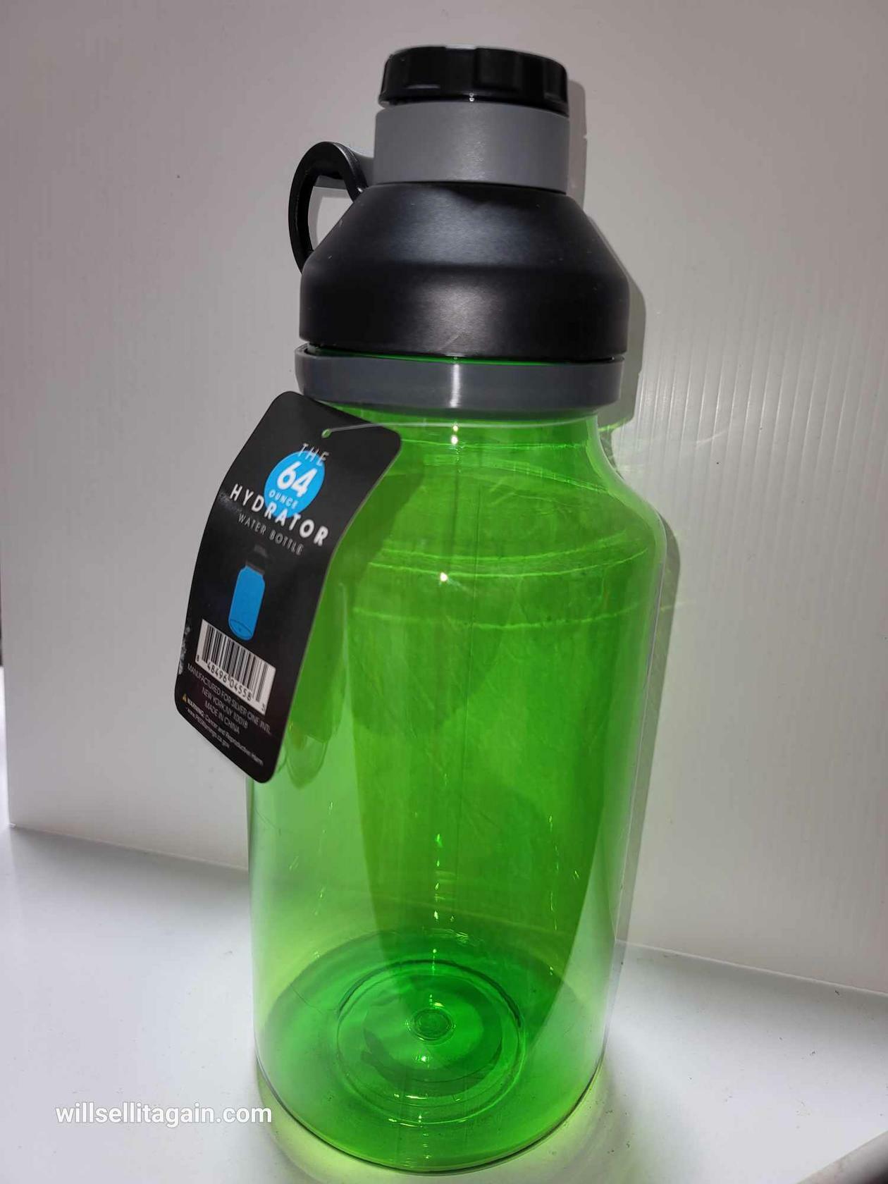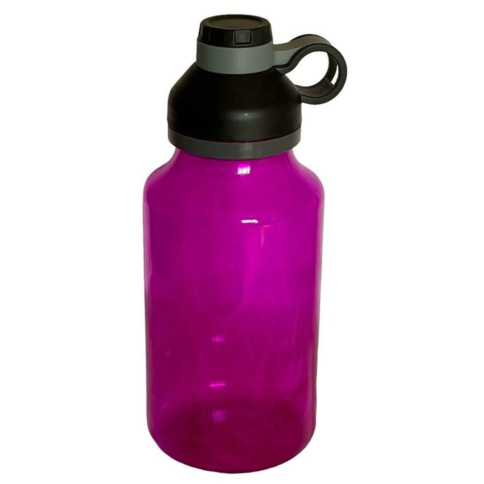 The 64 oz. Hydrator Water Bottle. The perfect take along for hiking, walking, cycling or road trips. Semi-transparent fuchsia pink bottle with two-way black and gray screw top. Sturdy loop for carrying. Hand washing is recommended.