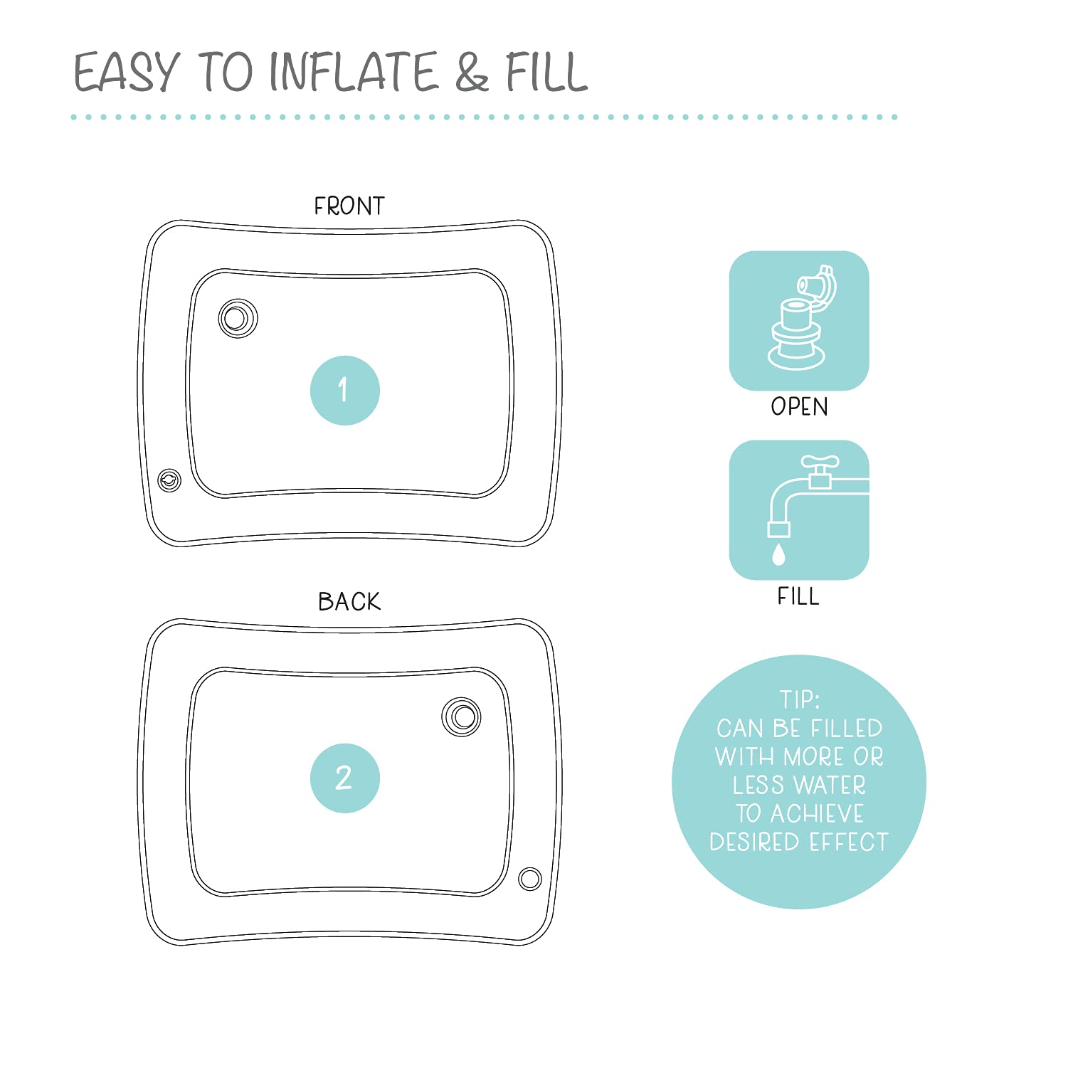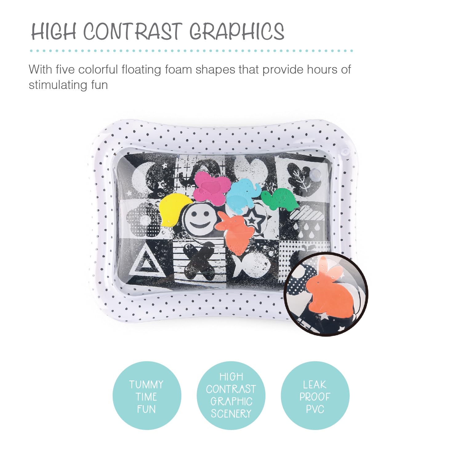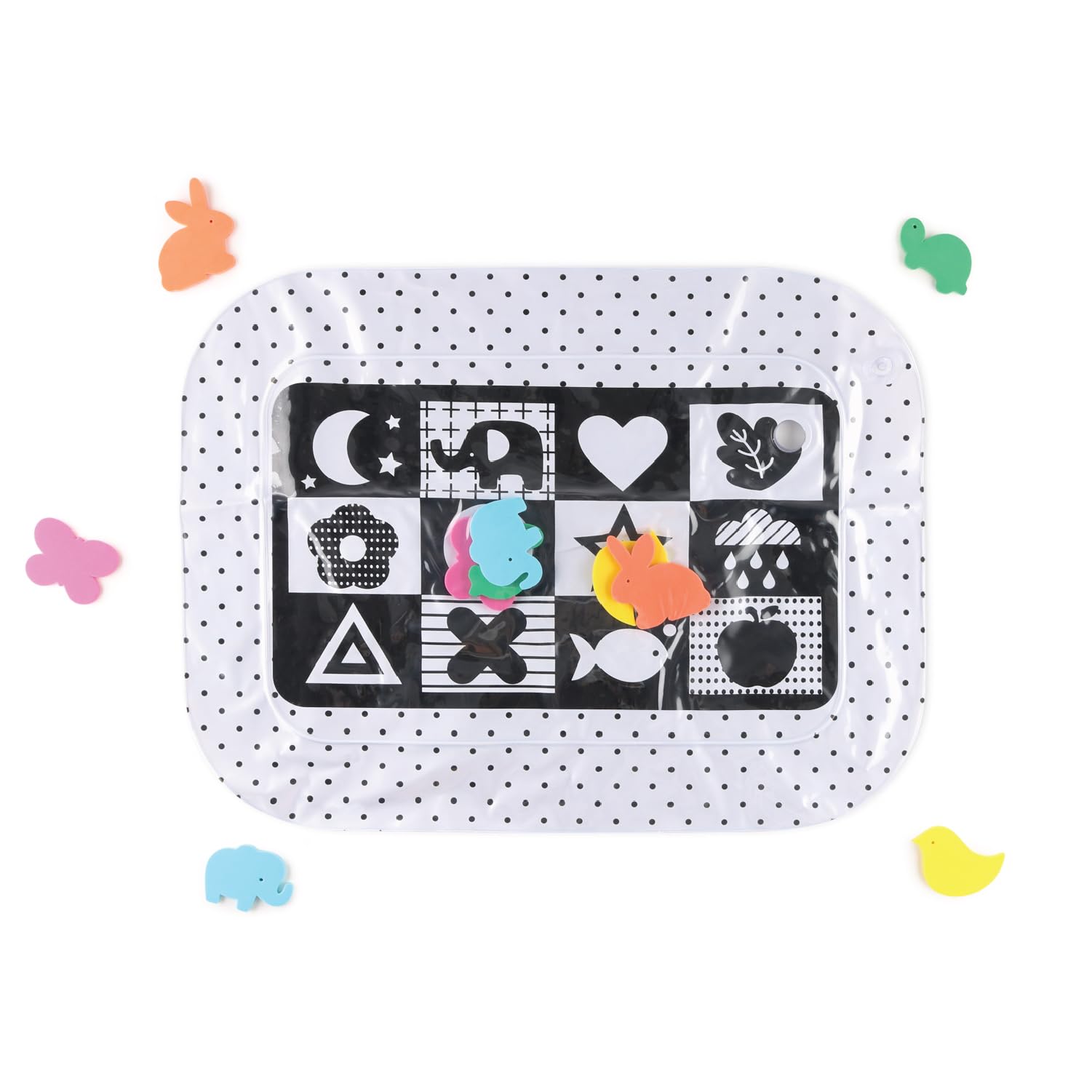 Enjoy the water time without getting wet! With our Montessori Tummy Time Water Mat, your little one can play to their heart's content in this safe and leak-proof mat activity center, while engaging in brain development and our stimulating design assist in developing hand-eye coordination. Plus, tummy time is essential to help strengthen your baby's leg and arm muscles as they prepare to crawl, all while playing on the floor. Our baby water mat is made of printed PVC, with colorful and adorable floating shapes of EVA. Strong black & white print is great for developing eyes, and a high contrast of colorful shapes of butterflies, birds, bunnies, and other animals are sure to entertain baby! Simply inflate the outer ring and fill the interior part with water for splash 'n' play time! After use, empty mat, fold or roll it, and pack up until next use. Have fun with your little one while they learn and splash away with this baby water play mat.