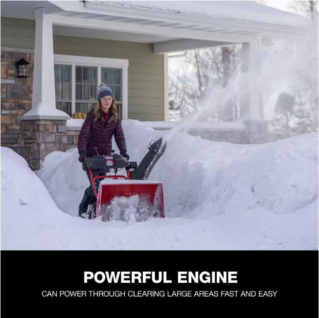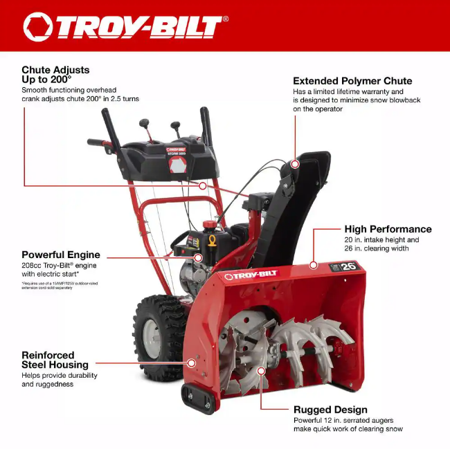 Clear large areas quickly with the 26 in. clearing width of the Storm 2600. The 208cc Troy-Bilt engine with electric start capability, and a self-propelled drive system help make the job easy. Just One Hand operation allows adjustment of the chute controls without disengaging the drive, including a quick change to the snow discharge height from the dashboard with the remote pitch control lever. The rugged, 12 in. serrated steel augers are designed to quickly handle up to 12 in. of snow.