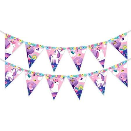 Transform your party into a whimsical wonderland with our rainbow unicorn birthday party supplies! Our unicorn party decor features fanciful unicorns rainbows butterflies and bunnies perfect for a unicorn theme birthday party. Made from high-quality materials it s durable and long-lasting ensuring that it can be used for multiple celebrations. The banner is preassembled and comes pre-strung for easy hanging. Check out our store for more unicorn decorations including backdrops cake toppers balloons and more! This rainbow unicorn happy birthday banner features: Pre-strung pennant banner comes ready for decorating and hanging! (1) pennant banner comes with 12 beautifully designed flats each measures 11.6 x 9.6 inch per pack. All pennant flags are made of coated durable flexible paper so they flutter like butterflies in the wind!
