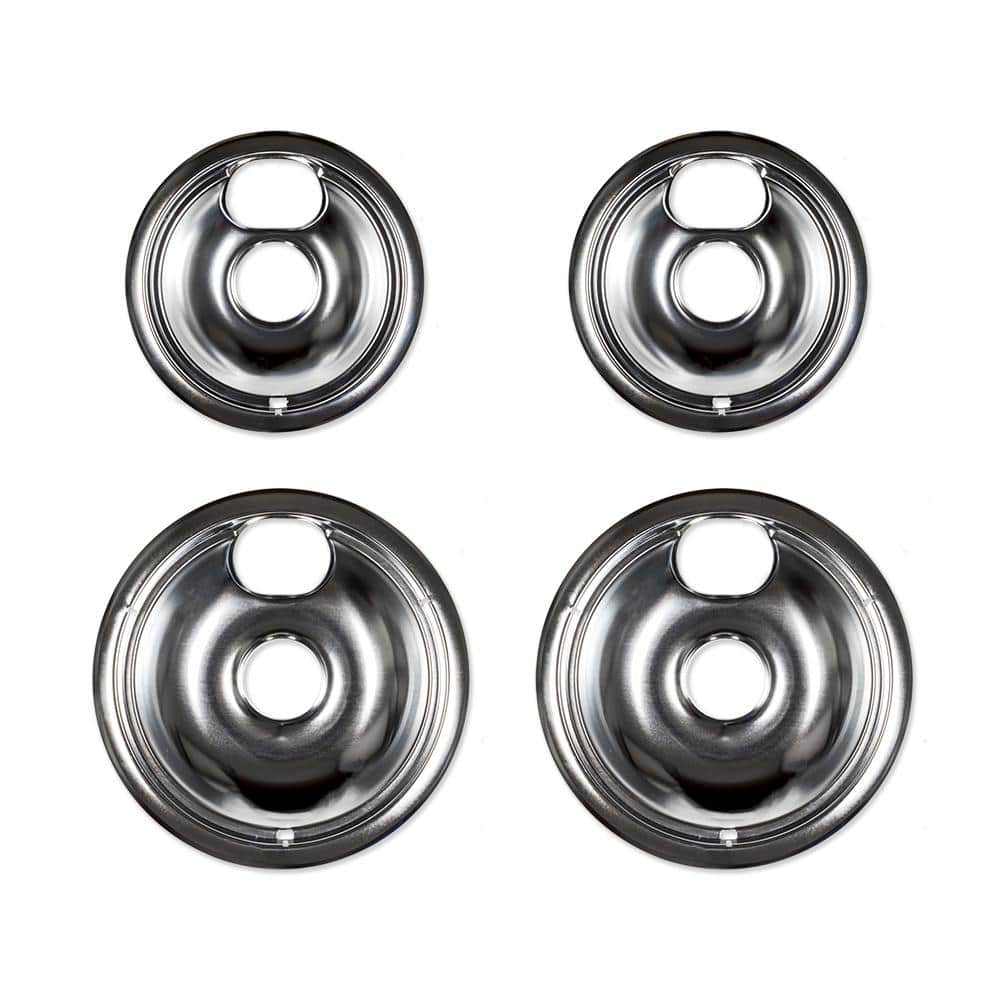 The Everbilt 4-pack chrome drip bowls are a replacement part designed to catch drips that occur while cooking, keeping your range clean. They fit most brands of plug-in electric ranges excluding GE and Hotpoint ranges. Replacing the drip bowls of your stove regularly will give it a renovated appearance, while improving your cooking results with more even heating. The chrome finish of the drip bowls enhance heating reflectivity, which directly affects the preparation of your meals. The ring and pan are combined into one piece drip bowls making them easy to clean and replace. This 4-pack includes (2) 8-inch bowls and (2) 6-inch bowls.